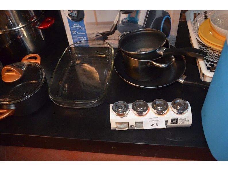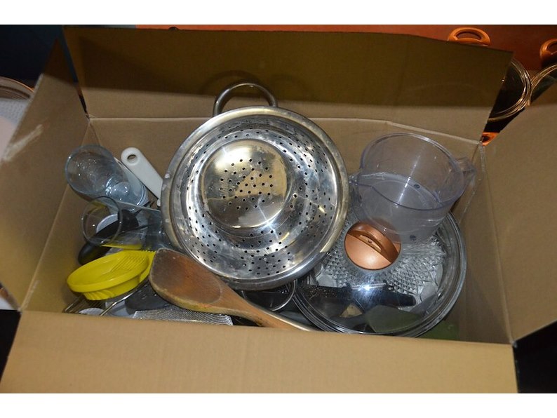 5 diverse kookpotten, 2 steelpannen, divers keukenmatieraal, frigobox blauw