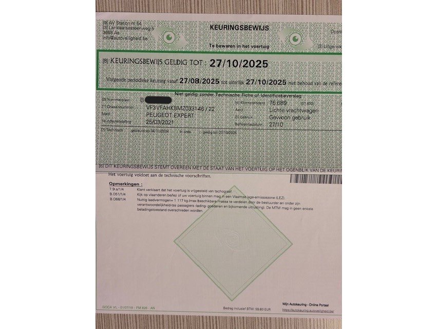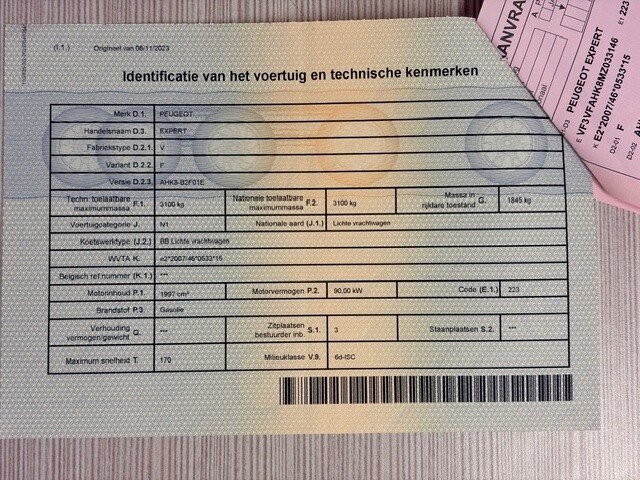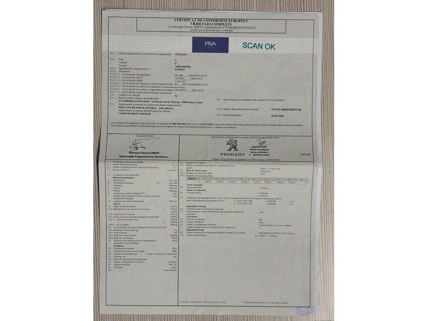 Lichte vrachtwagen peugeot expert, type: v, variant: f, versie: ahk8-b2f01e, chassisnummer: vf3vfahk8mz033146, bouwjaar: 25/03/2021, met kentekenbewijs deel i en ii , gelijkvormigheidsattest, schouwingsbewijs (verlopen) en 1 sleutel