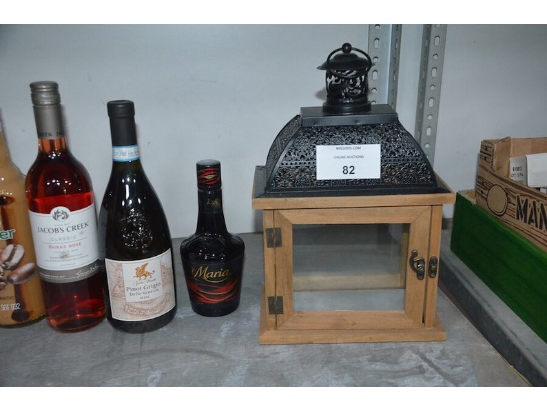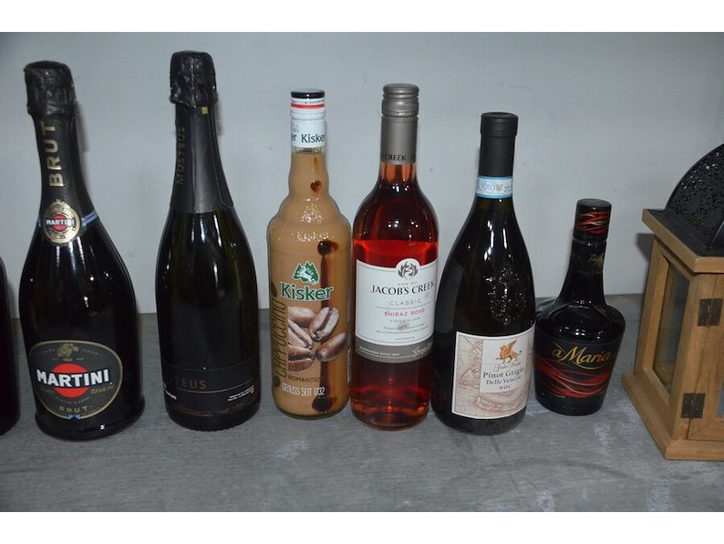 8 flessen diverse drank, pvc boedhabeeld, windlicht, theelichthouder, vaas