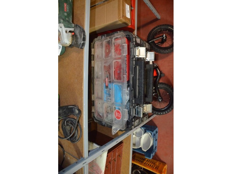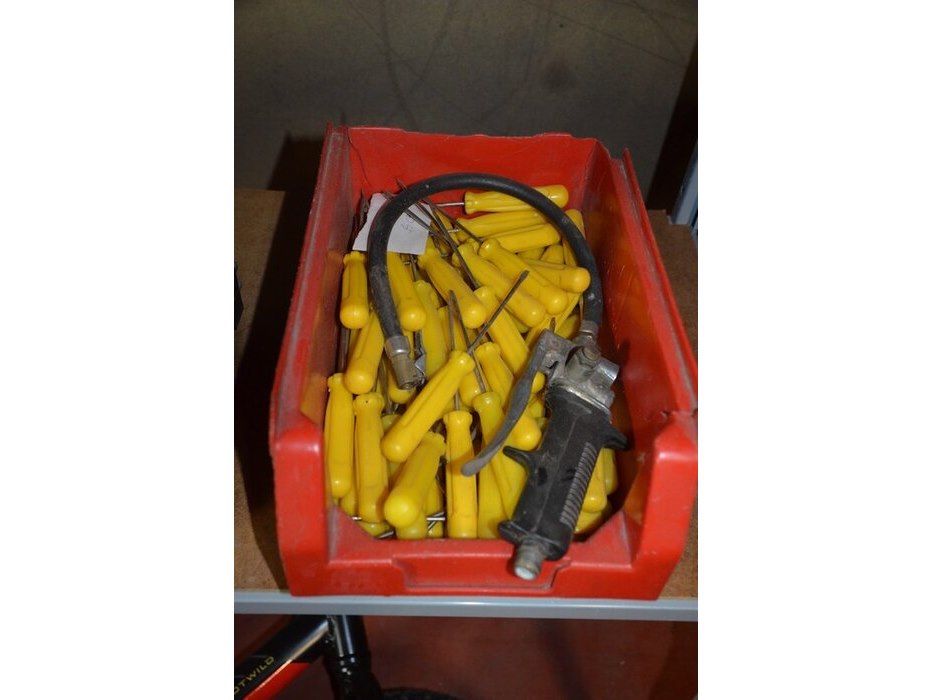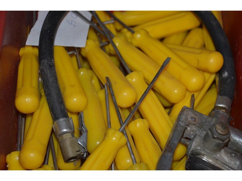 Pvc bak met platte schroevendraaiers, doos met 100 paklijstenenveloppen, 2-delige pvc vakken kist keter gevuld met moeren en bouten