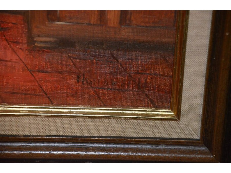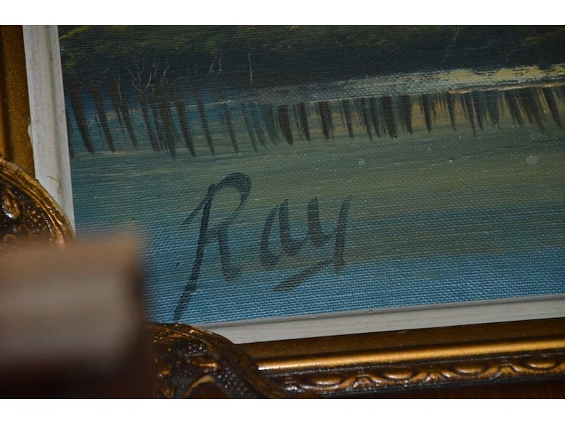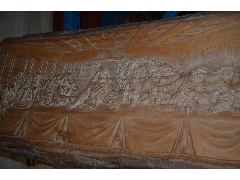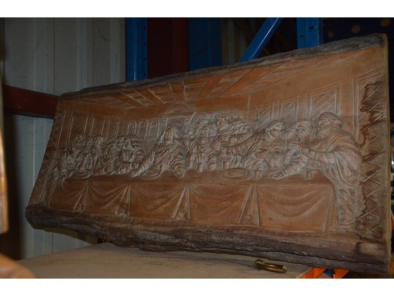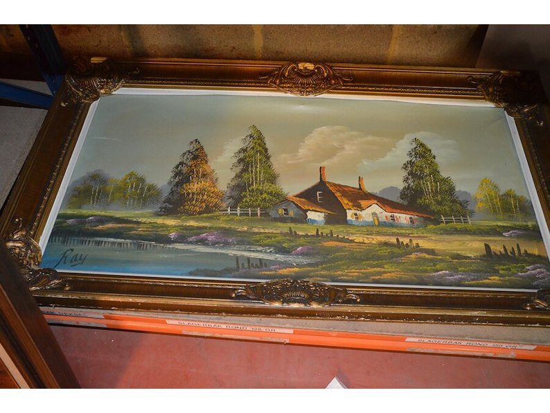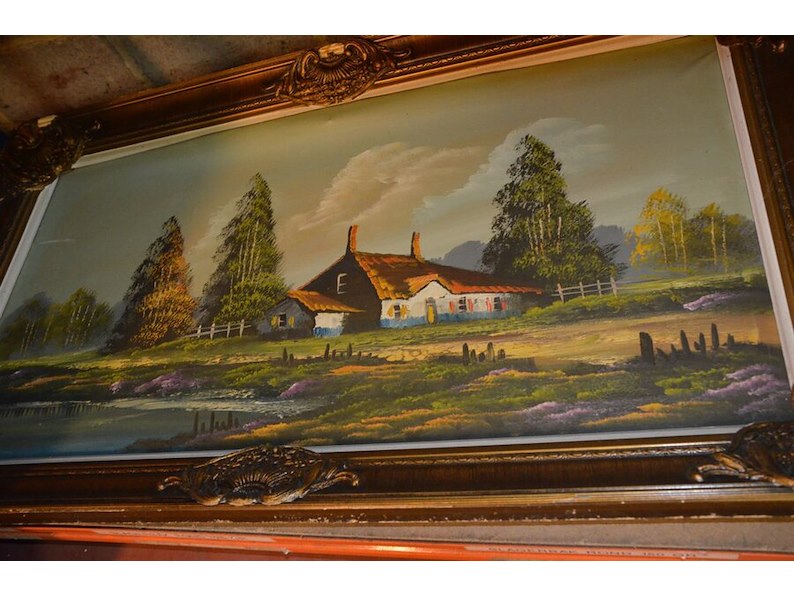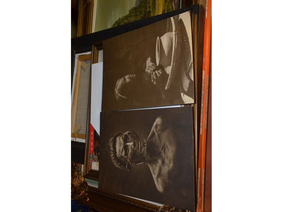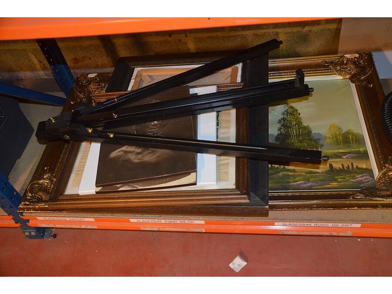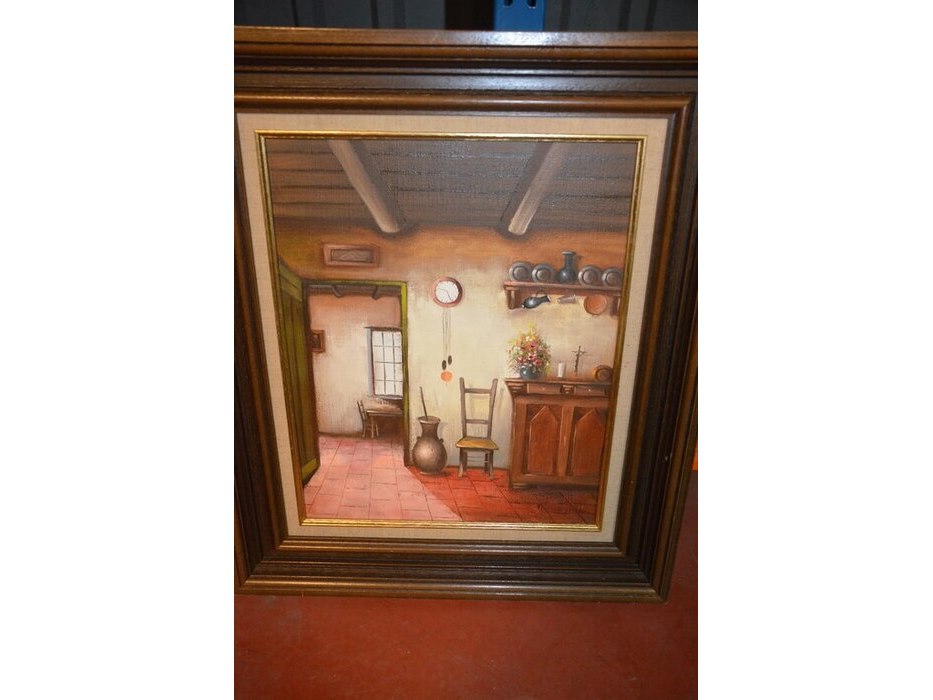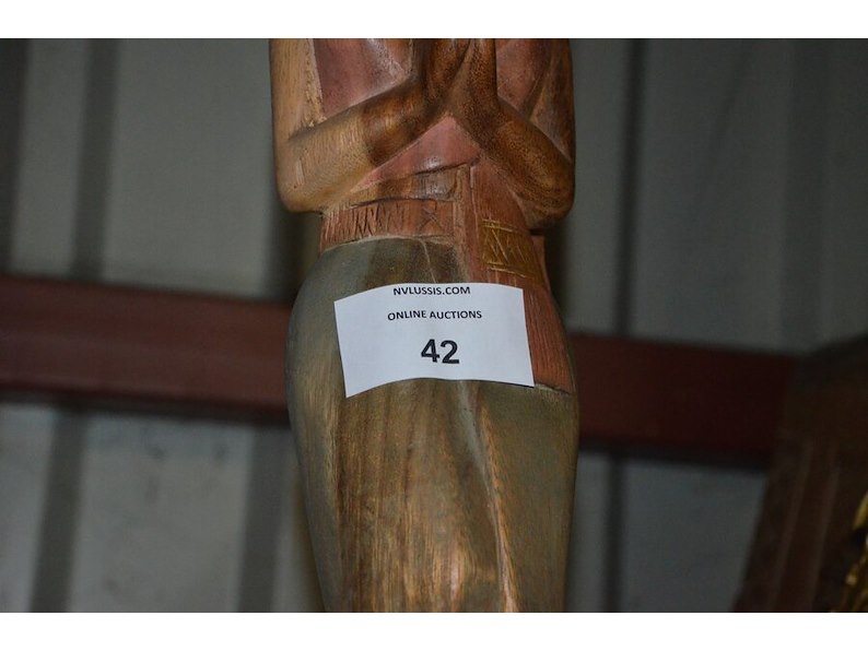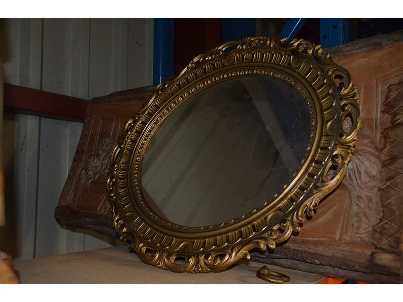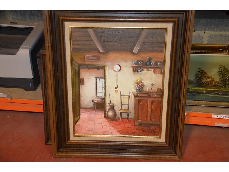 3 houten beeldjes, houtsnijwerk , ovale spiegel in goudkleurige kader, diverse schilderijen en wandversieringen