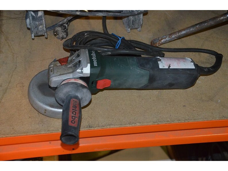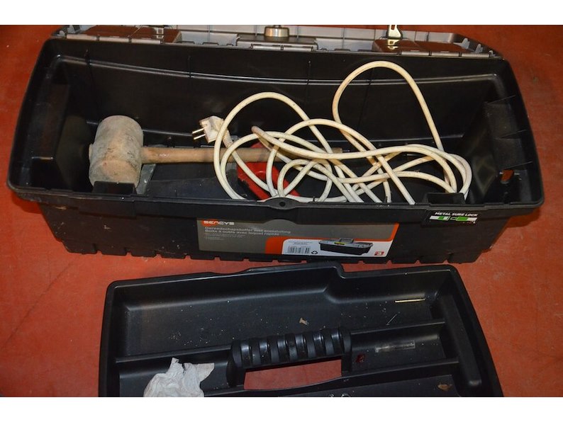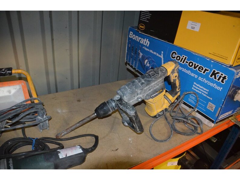 Pvc werkkoffer, boorhamer powerplus powx11831, slijpschijf metabo (defect), ophanging bonrath en mad, 2 led werflampen
