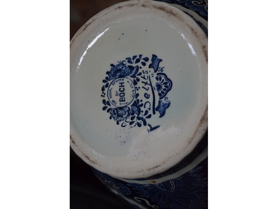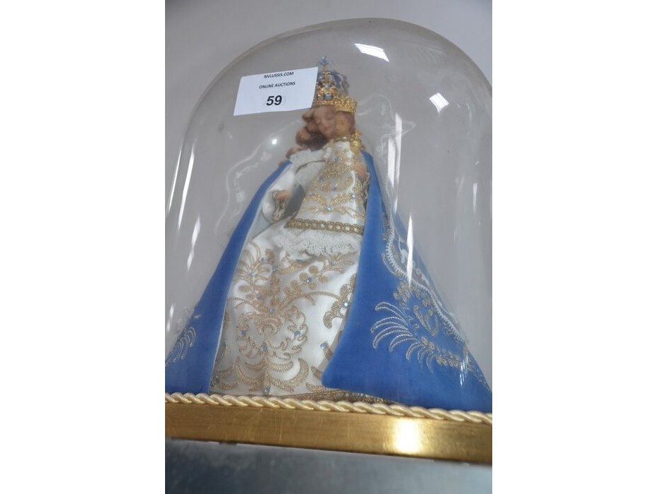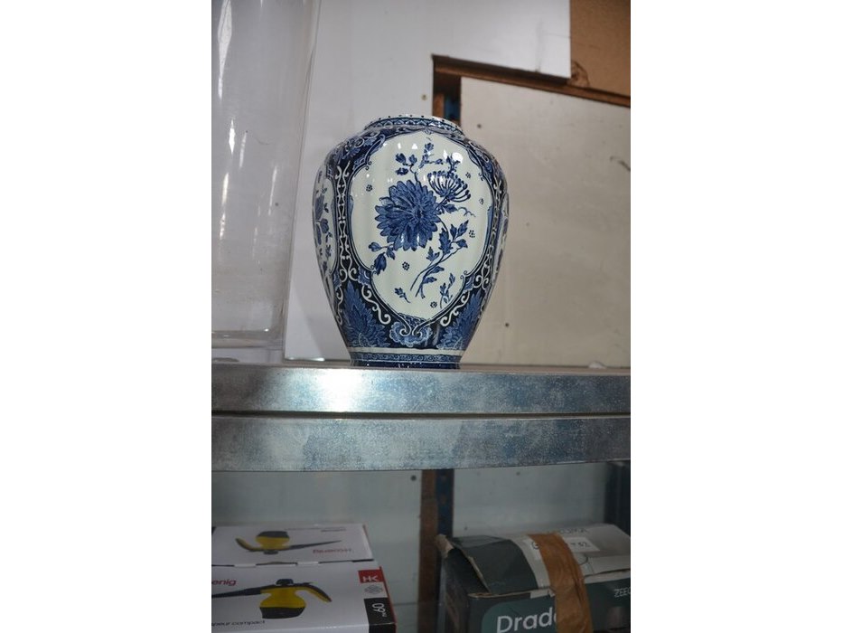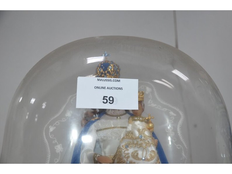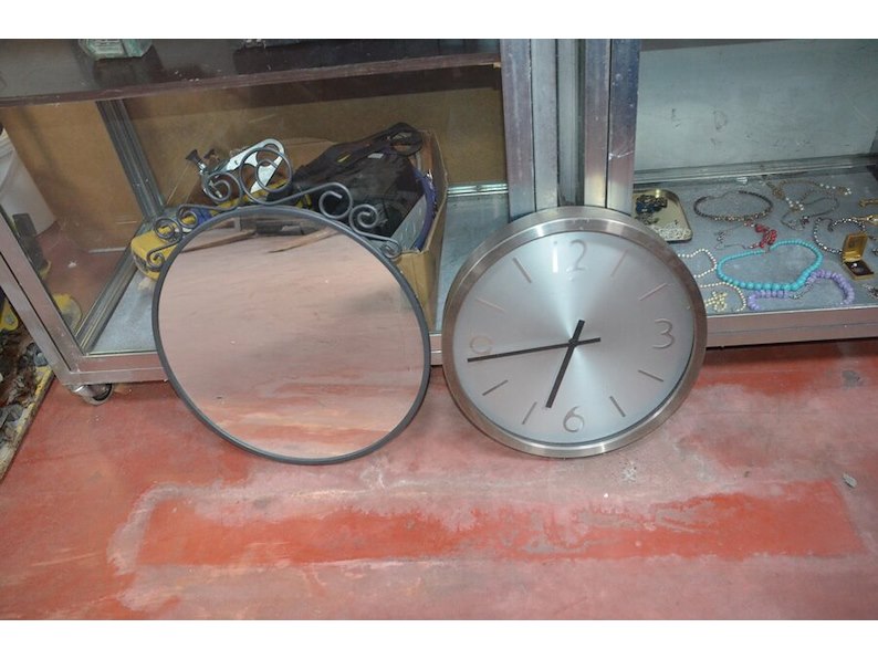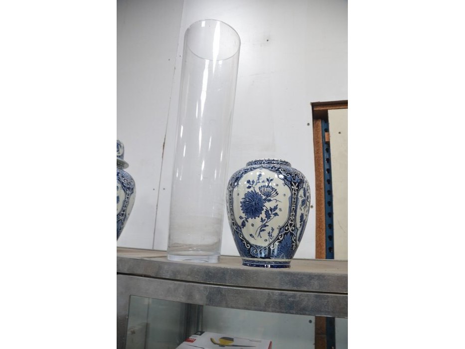 Blauw delfst aardewerk met deksel, blauw delfst vaas, mariabeeld onder glazen stolp, ronde wandklok, glazen vaas, ronde spiegel