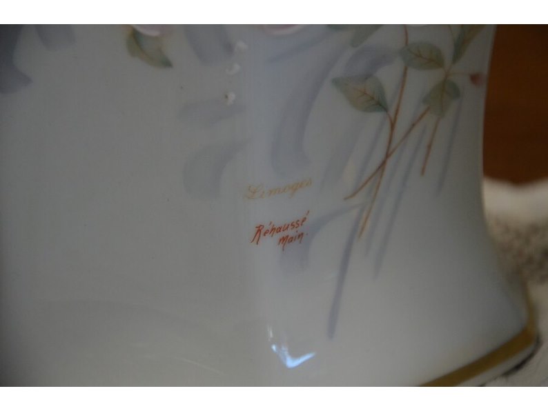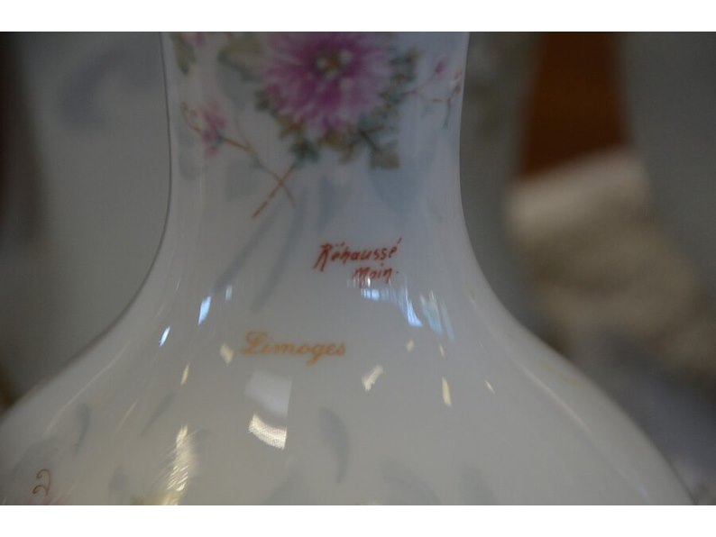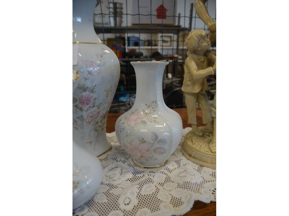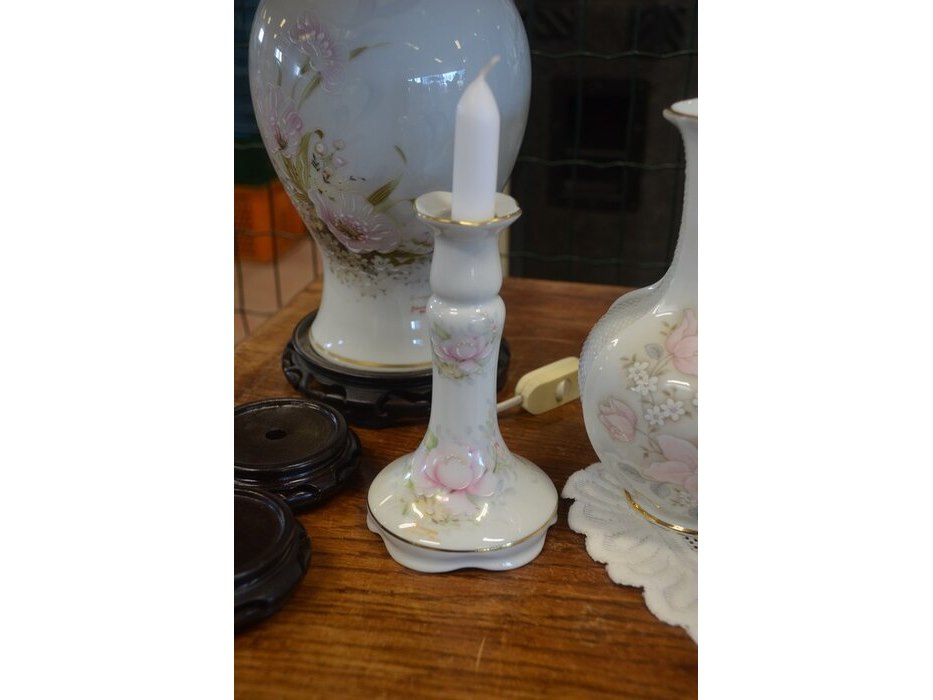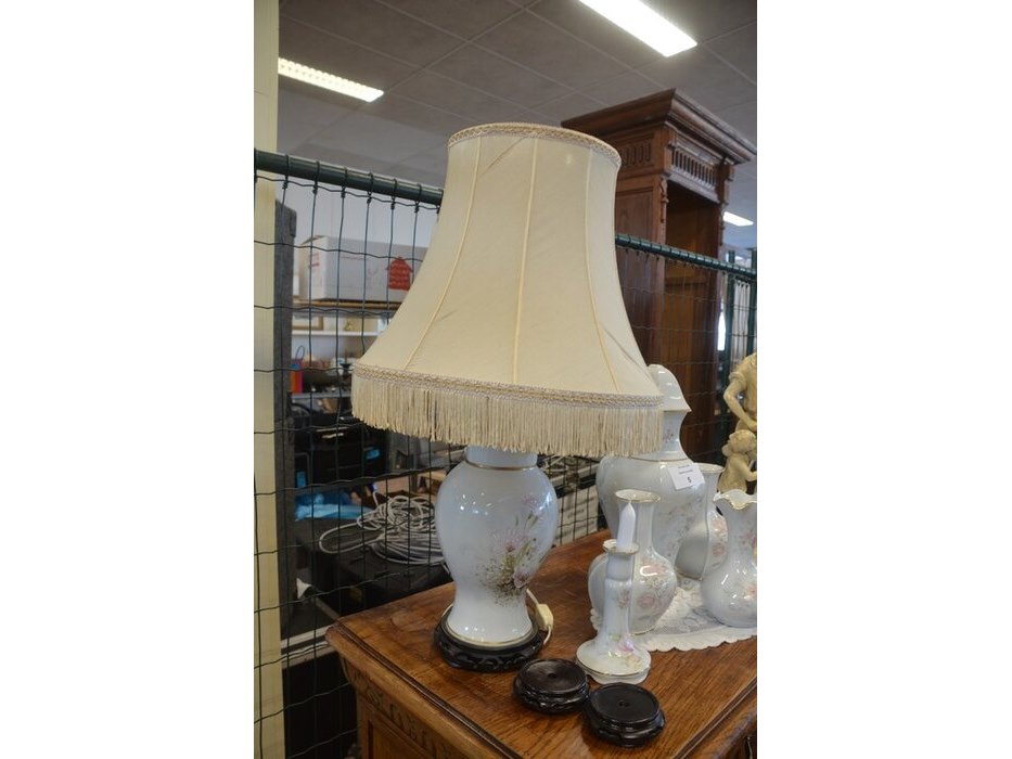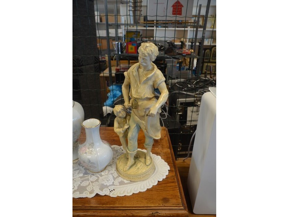 Mechelse eiken kast 2 deuren 2 laden afm. 150x50x80, bruin houten kast laag model 2 deuren 2 laden afm. 100x55x105, beeldje vader met kind, 5 diverse sierstukken limoges, lamp met kap limoges