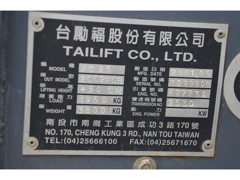 Heftruck tailift op gas met sideshift model fg 25, bouwjaar 2001