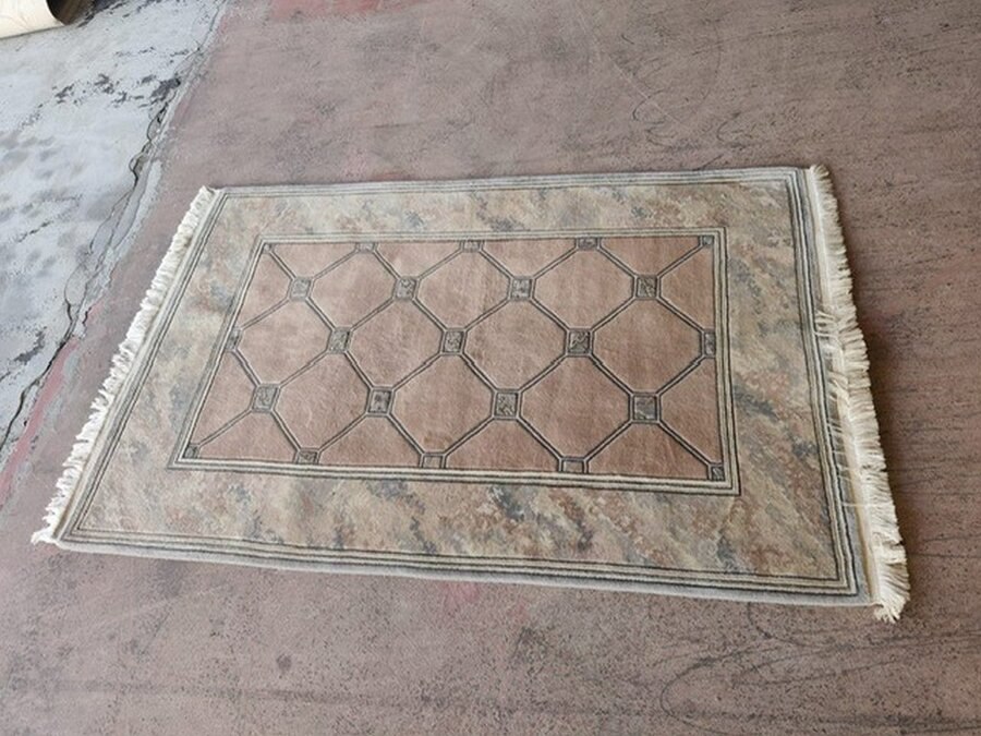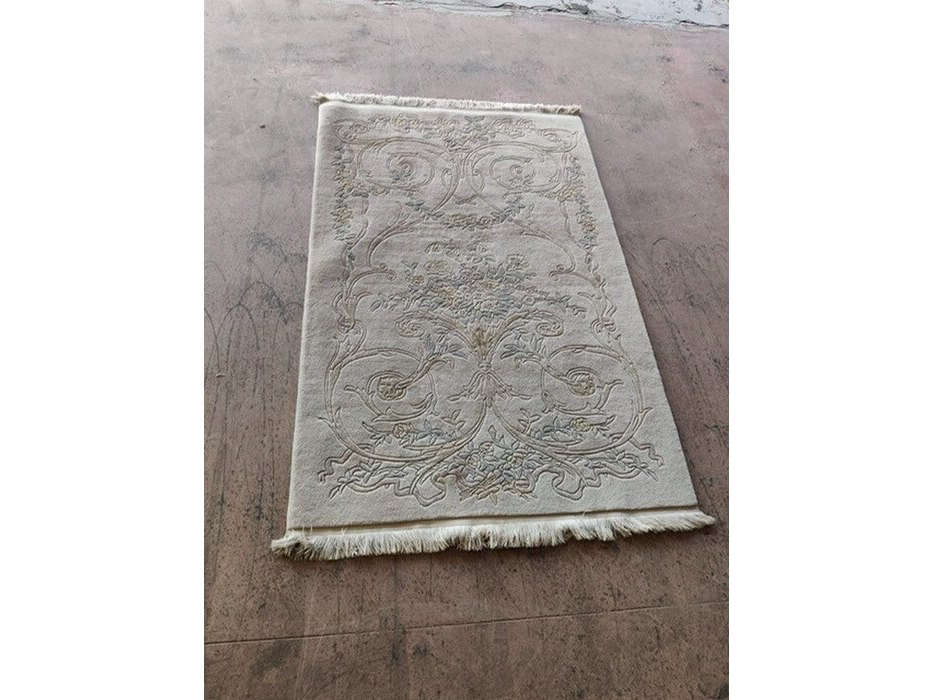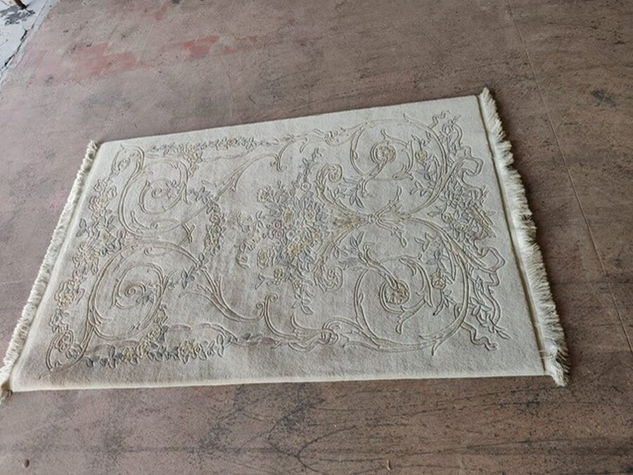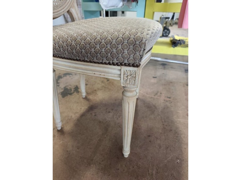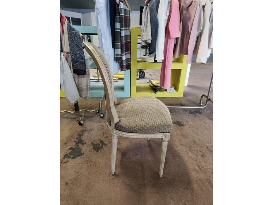 4 stoelen wit met rieten rug en stoffen zit, 2 stoelen met armleuning wit met rieten rug en stoffen zit, 3 kleine tapijten