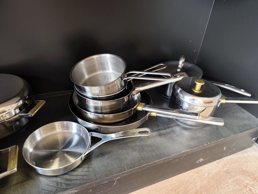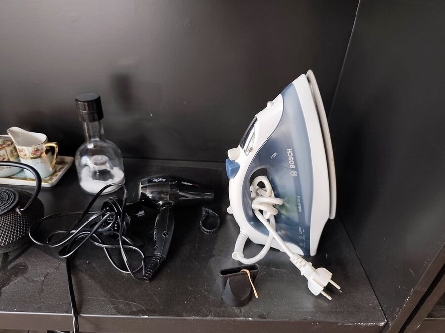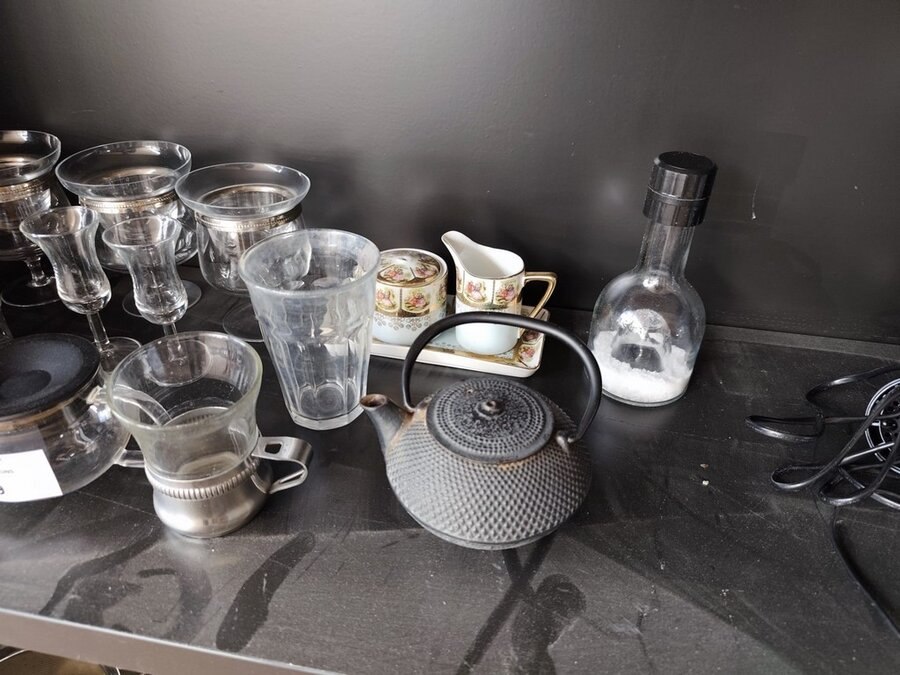 11 potten en pannen, 4 inox schalen, zak met divers bestek, 10 glazen, haardroger, stoomstrijkijzer bosch