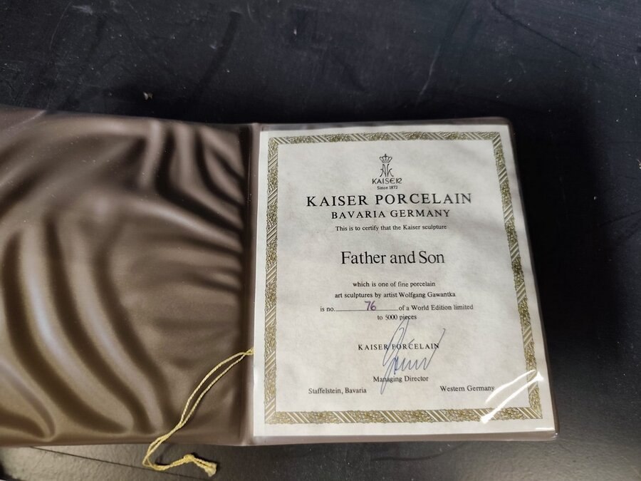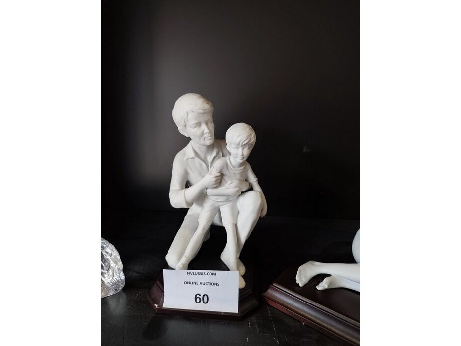 2 porseleinen beeldjes moeder&zoon, vader&zoon met certificaat, beeldje val saint lambert, glazen beeldje vrouw, glazen vaas lalique, glazen zwaan lalique