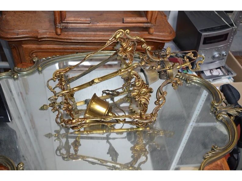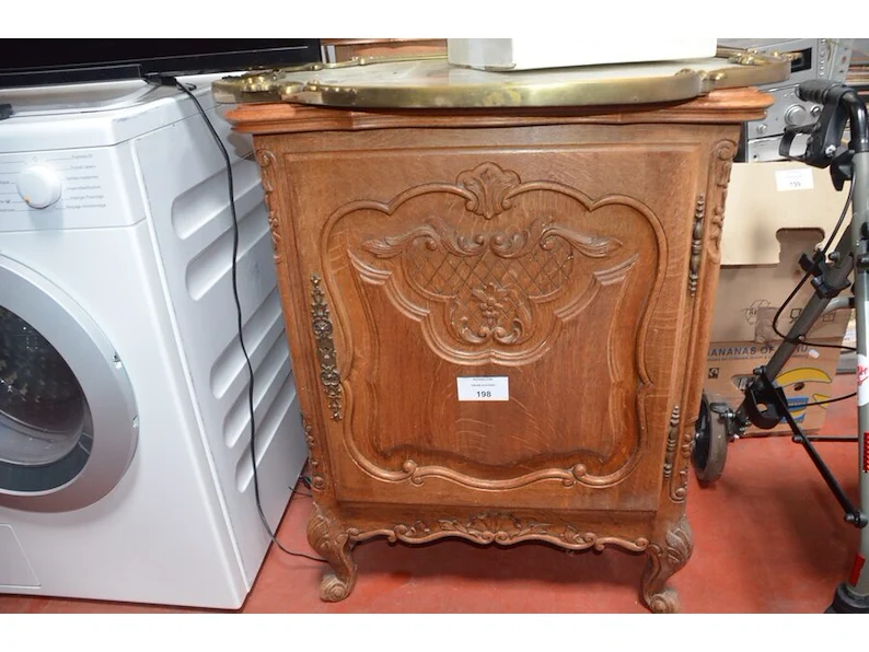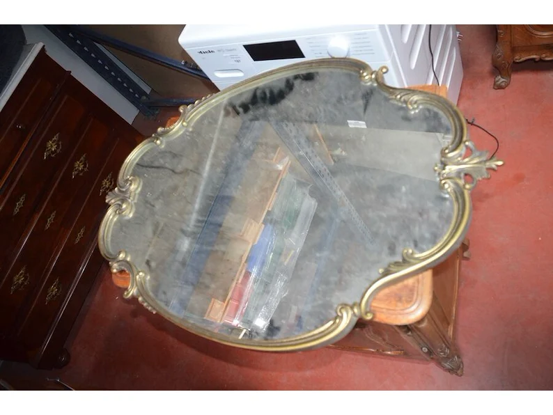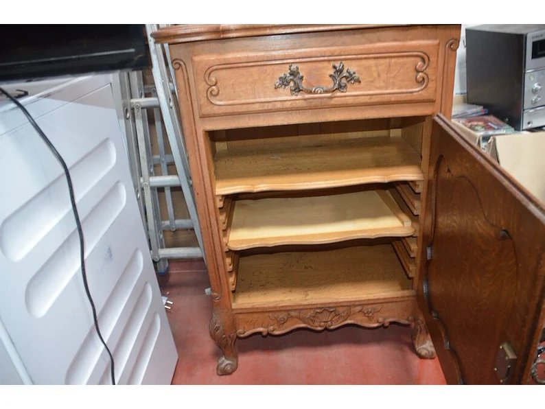 Houten kast tafelmodel met 1 deur 60x40x84 cm, houten kast tafelmodel met 1 deur en 1 lade 60x40x92 cm, bijzettafeltje met glazen blad 36x36x36 cm, spiegel in goudkleurige kader, luster met 1 lichtpunt