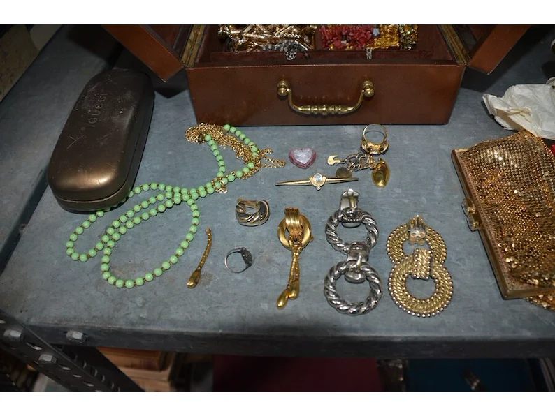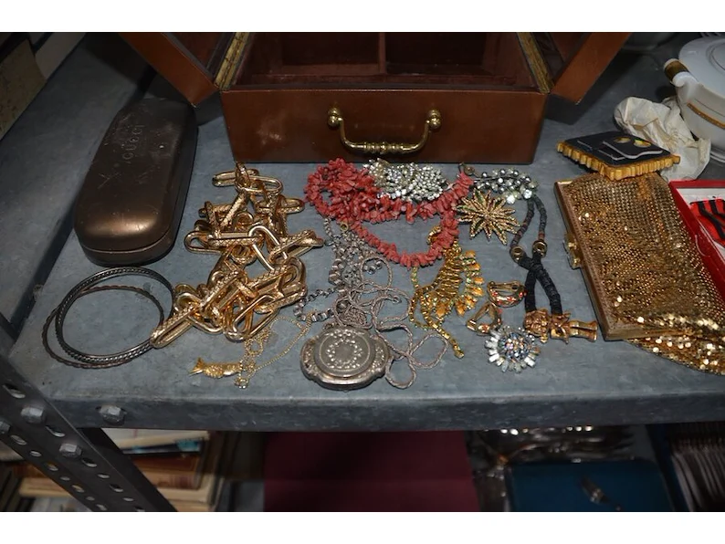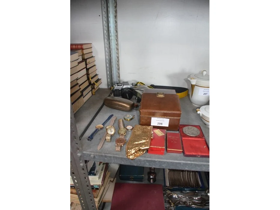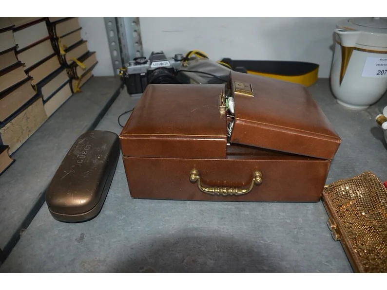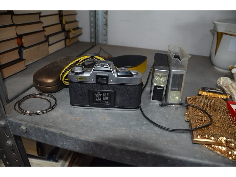 Filmrol fototoestel minolta xg-1 met lens md 50 mm 1:2, juwelendoos met sier juwelen, 6 polshorloges, goudkleurige portemonnee, leesbril