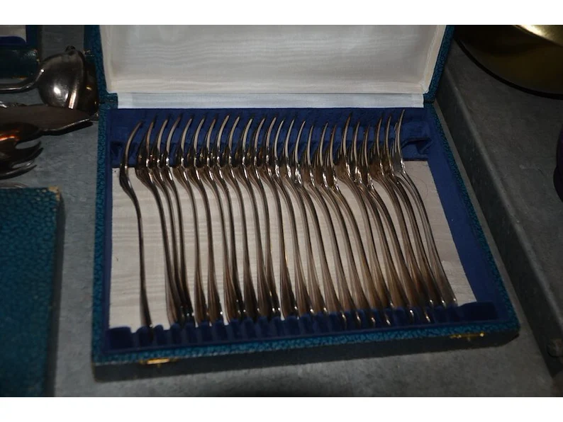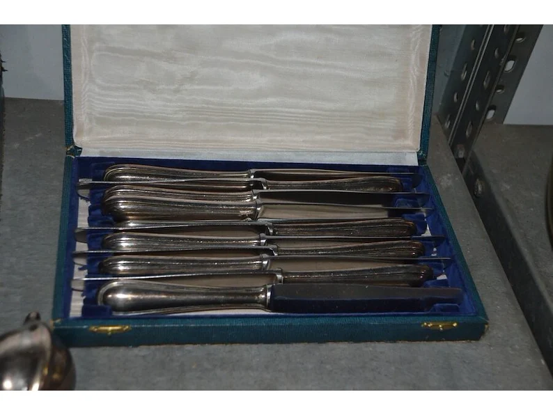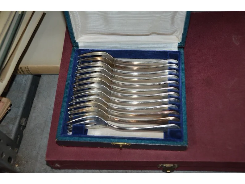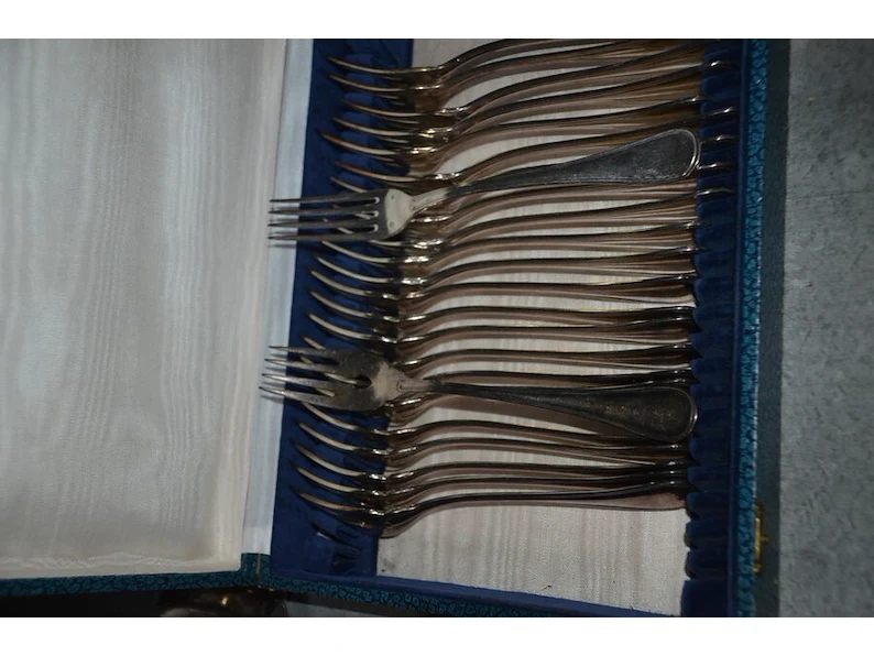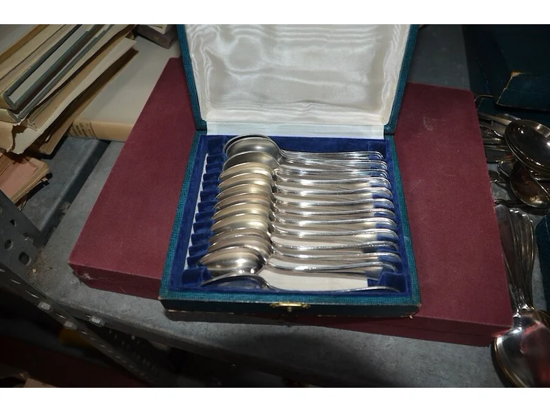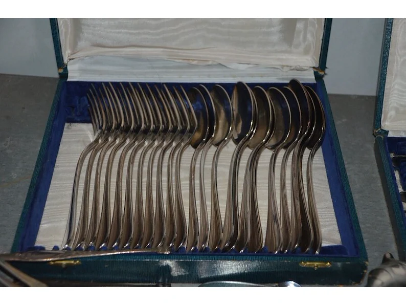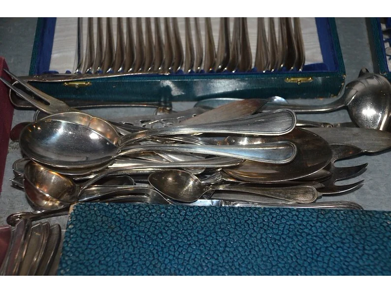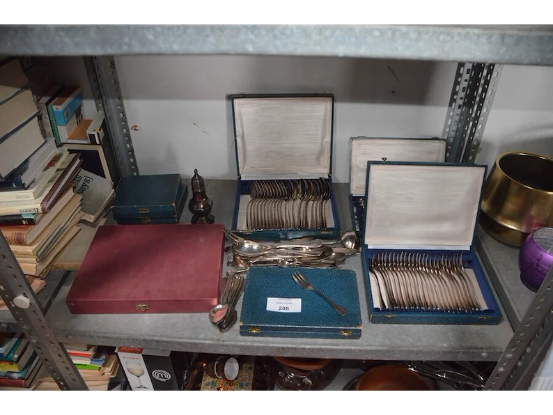 2 messensets in doos, vorkenset in doos, vorken- en messenset in doos, dessertvorkenset in doos, koffielepelset in doos, diverse lepels en vismessen, suikerstrooier, 6-delig bestek in doos