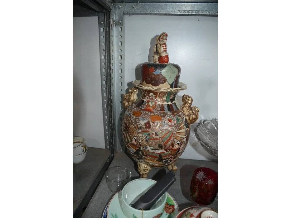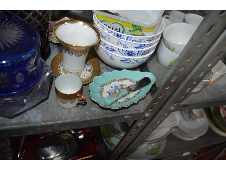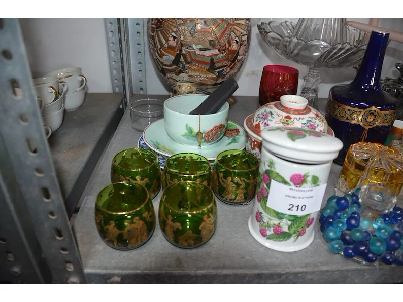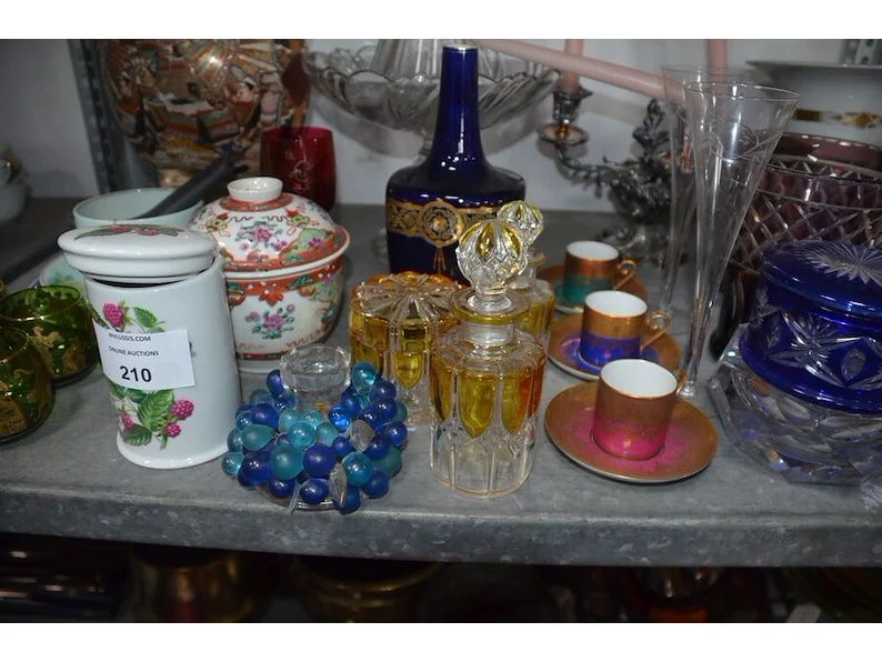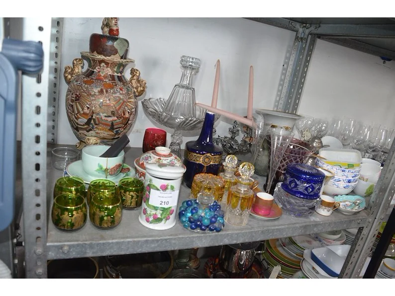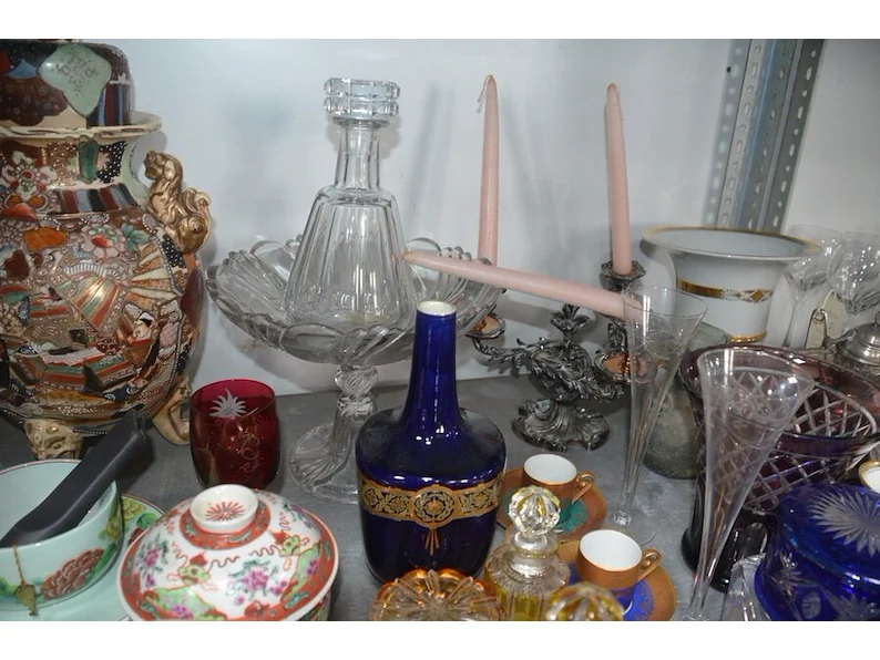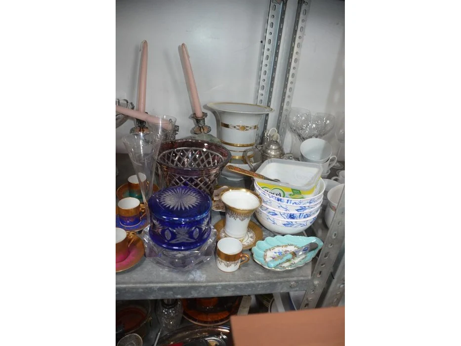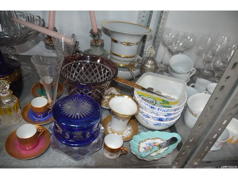 8 diverse glazen, 4 tassen met ondertas, 3 vazen, kandelaar met 3 lichtpunten, 7 kannen