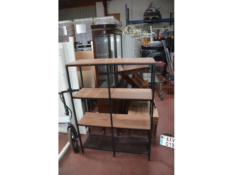 Modern rek 4 leggers afm. 100x36x136, vitrinekast 2 deuren 1 glazen deur afm. 100x44x180, verrijdbaar tv meubel afm. 70x52x70, salontafel houten blad metalen onderstel afm. 113x48x48