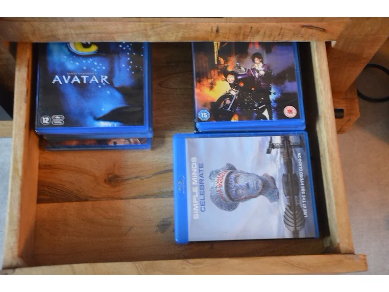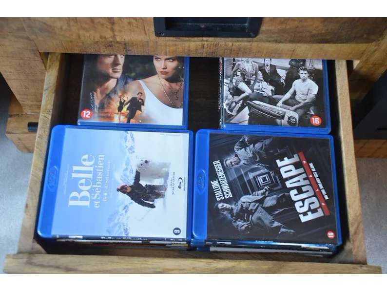 Modern houten tv meubel afm. 200x45x51 met 2 schuifdeuren 4 laden, bluetooth speaker sony srs-xb33, blu-ray speler sony , partij blu-ray films