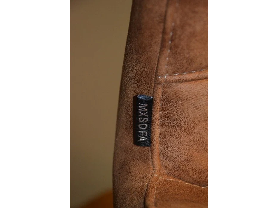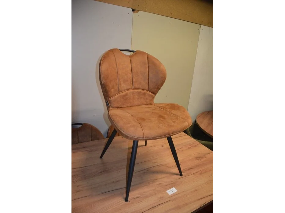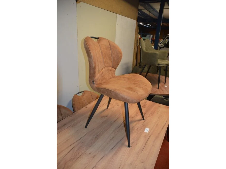 Rechthoekige bruine fineerhouten tafel 100x220cm , 6 moderne kuipstoelen bruin stoffen zit en rug (9,14)