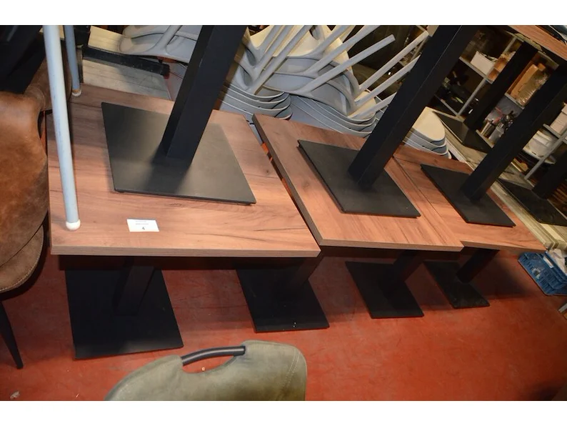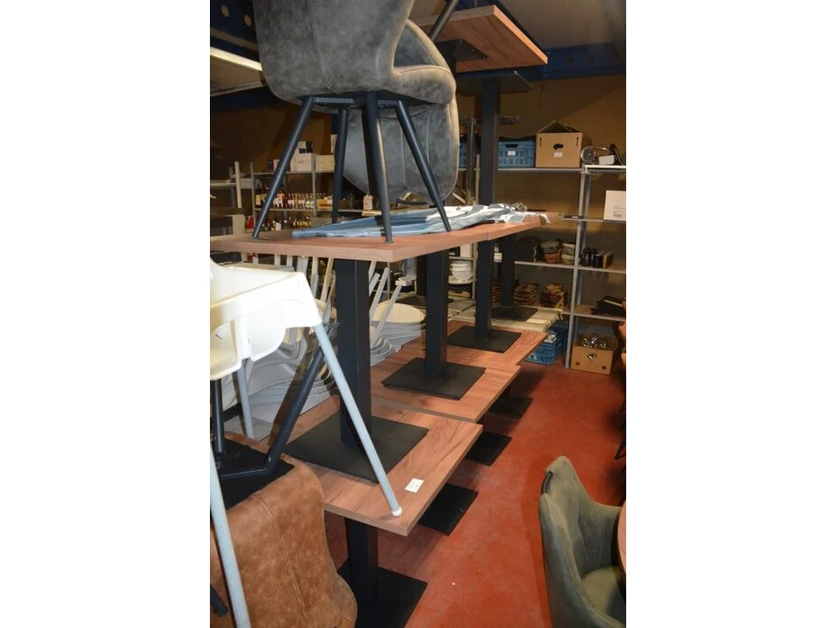 8 bruin fineerhouten bistro tafels 70x70cm , 11 moderne kuipstoelen grijze stoffen zit en rug , 5 moderne kuipstoelen bruin stoffen zit en rug , moderne grijze stoffen muurbank (6,8,9,10)