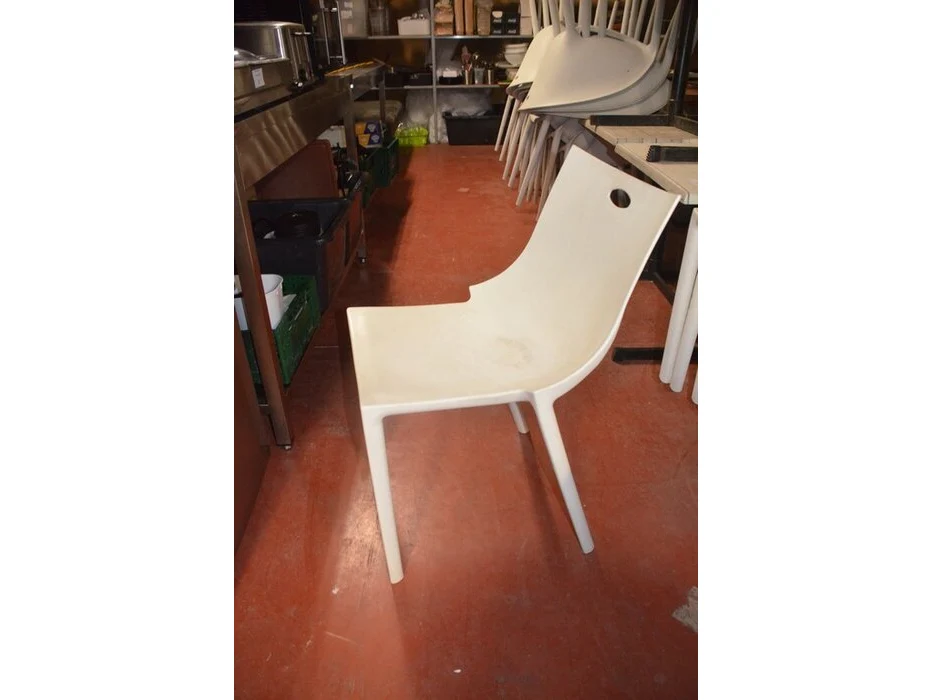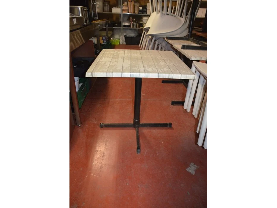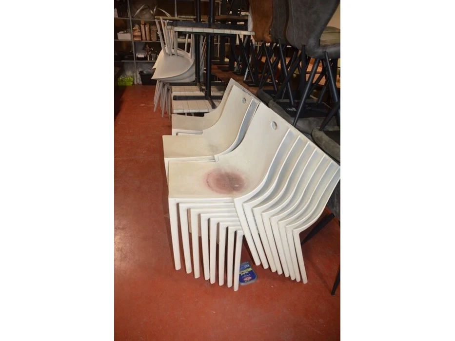6 bruin rechthoekige bistro tafels 70x70cm , 23 wit plastiek kuipstoelen (48,49)