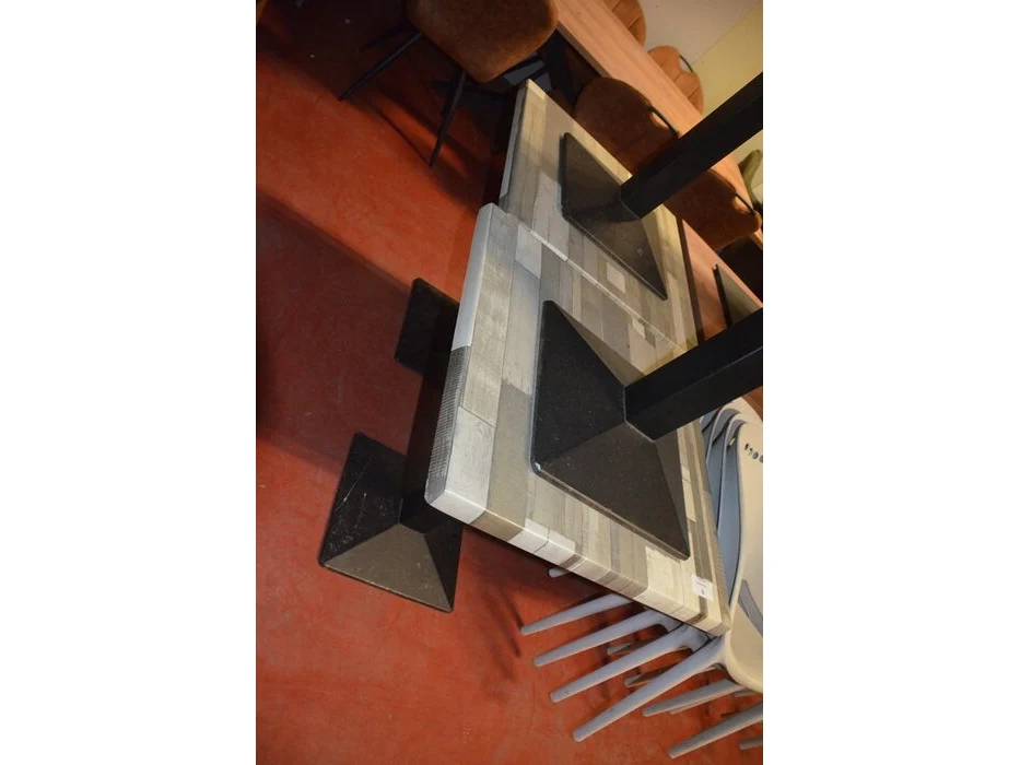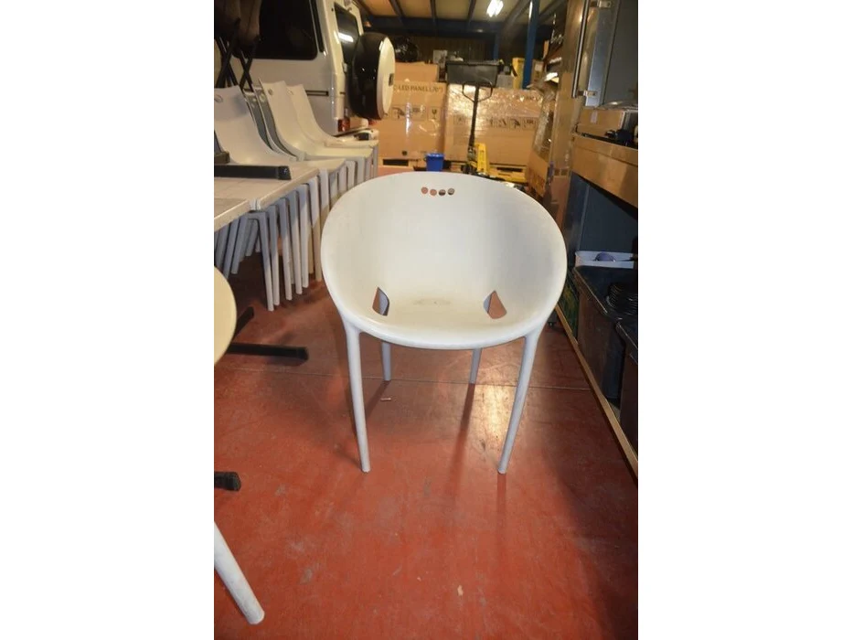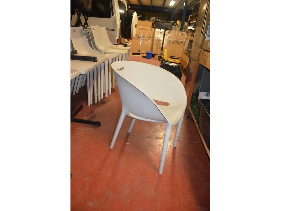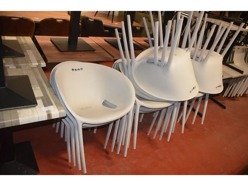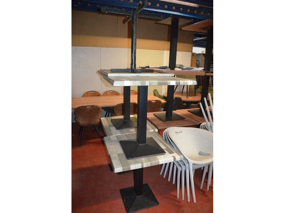 5 bruin rechthoekige bistro tafels 70x70cm , 18 wit plastiek kuipstoelen (48,49)