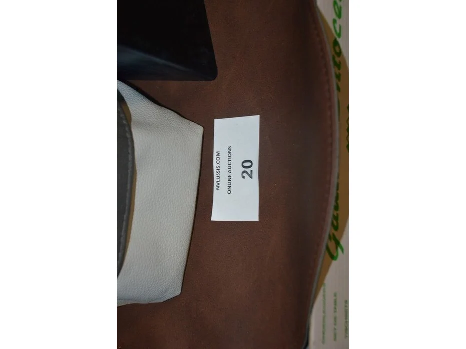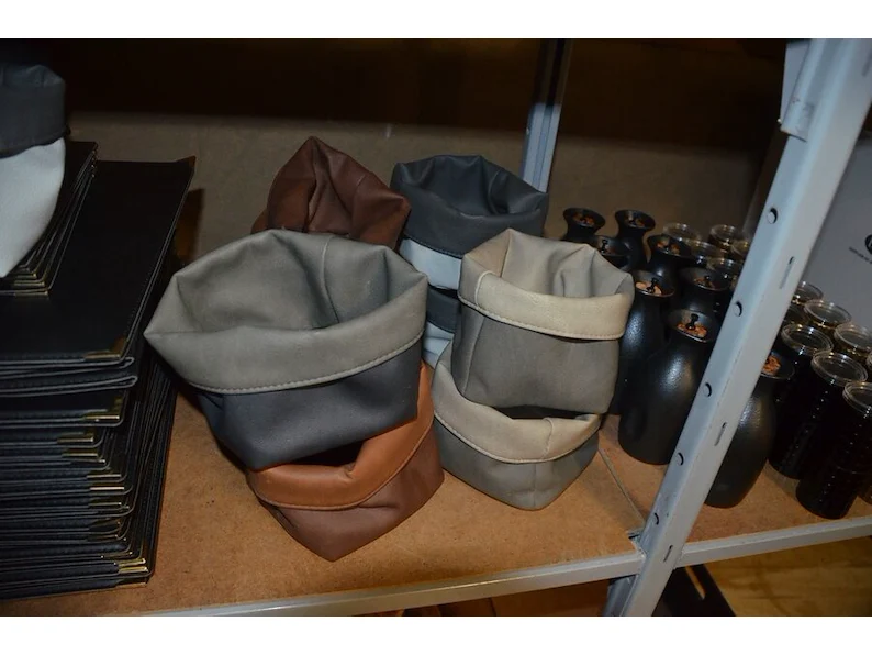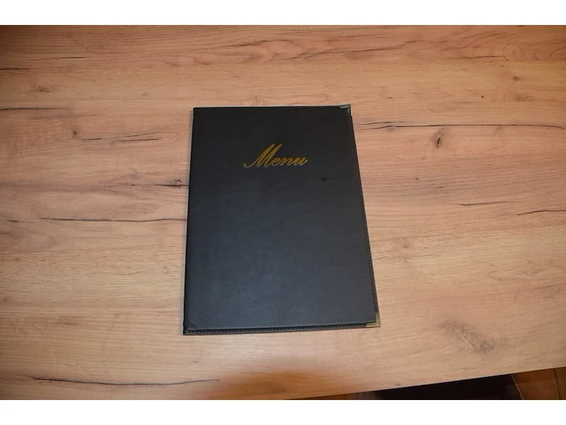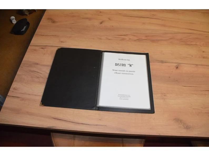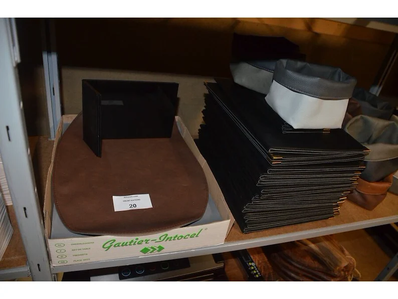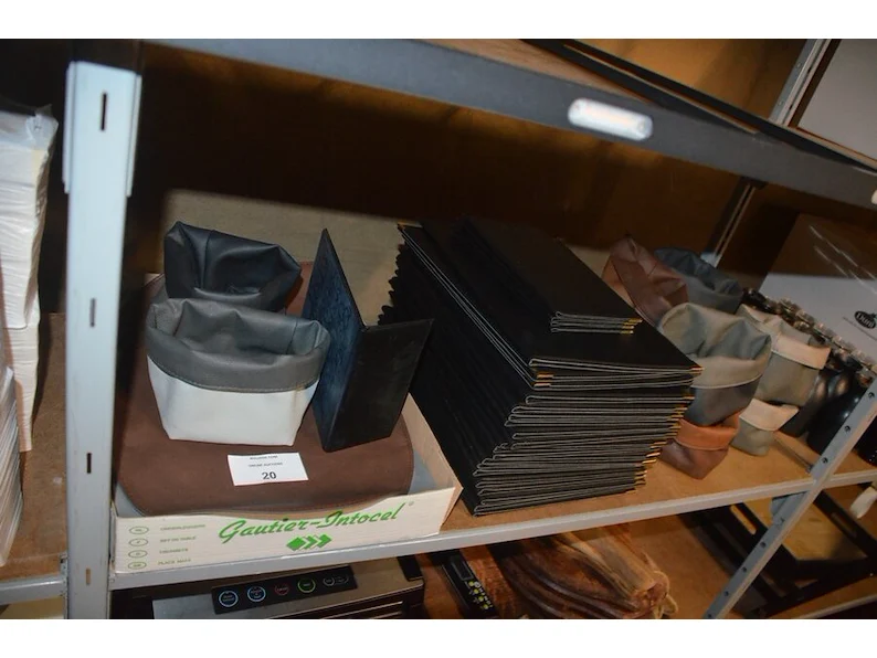 Ca. 22 imitatielederen placemats (grijze en bruine kleur), ca. 22 menukaarten , ca. 11 pakken servetten (11,39,41)