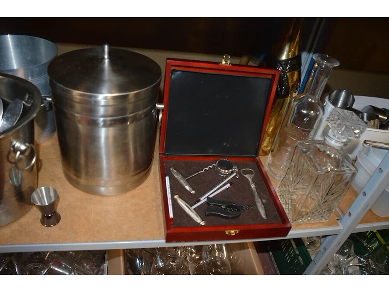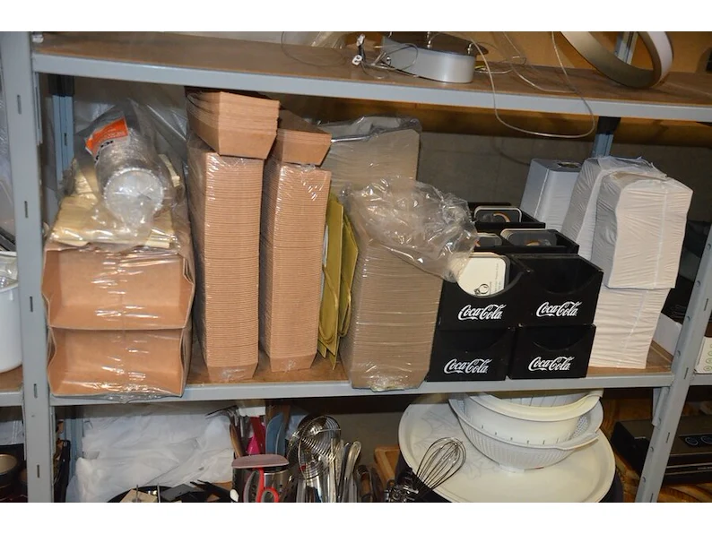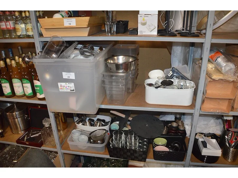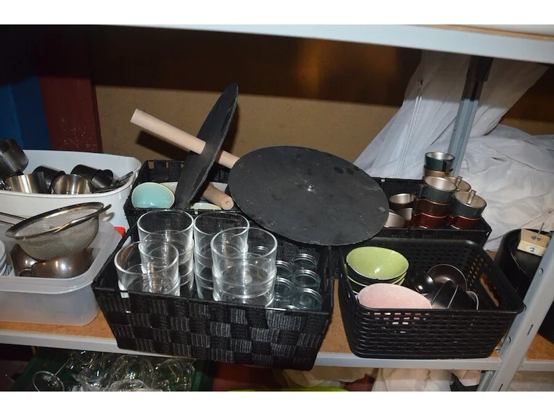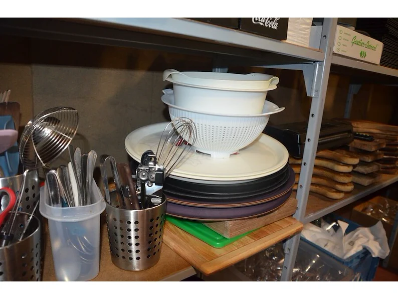 Divers keukengerief w.o. lepels, plastiek bakjes, glazen kommetjes, porseleinen kommetjes, inox sauspotjes (38)