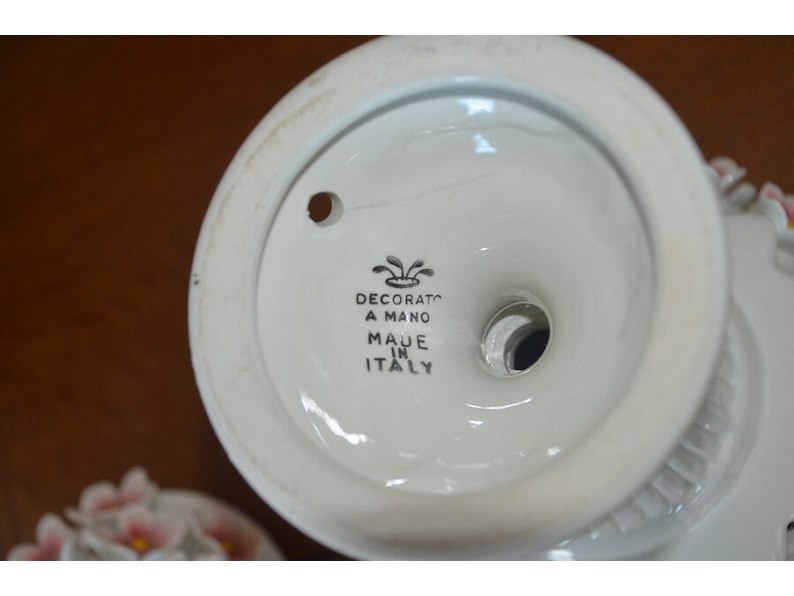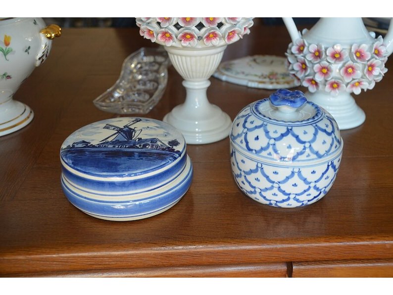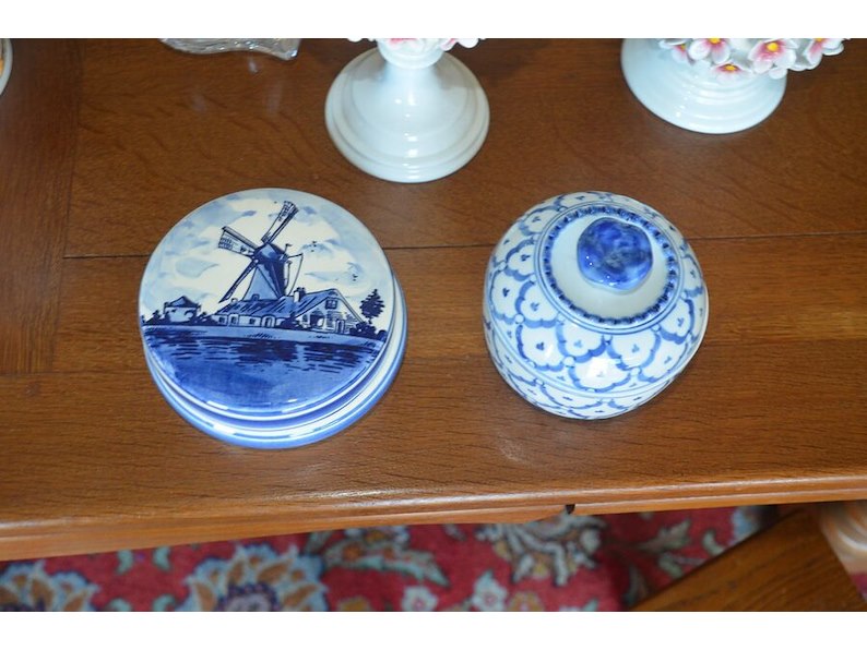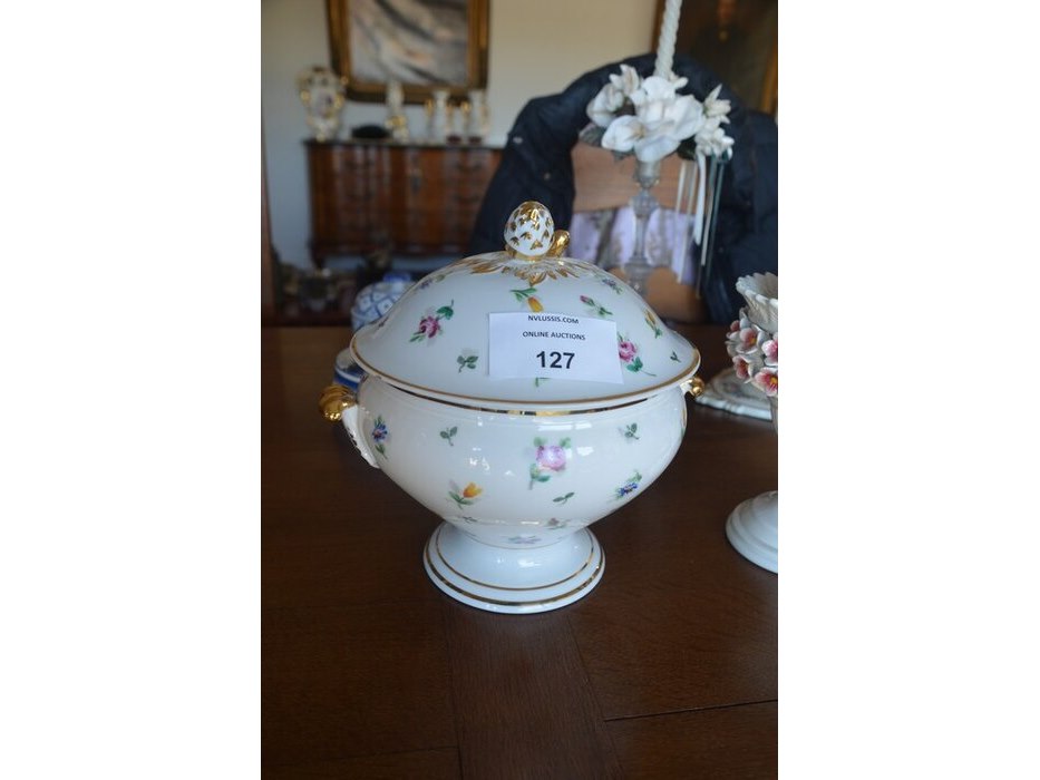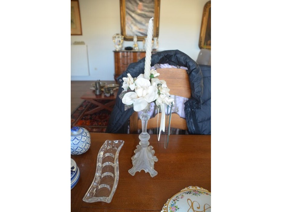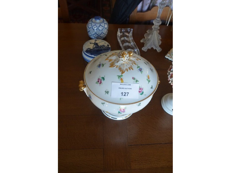 Terrine met deksel porselein, 2 sierstukken porselein, glazen kandelaar en 4 sierstukken
