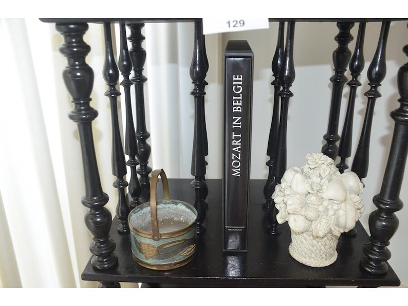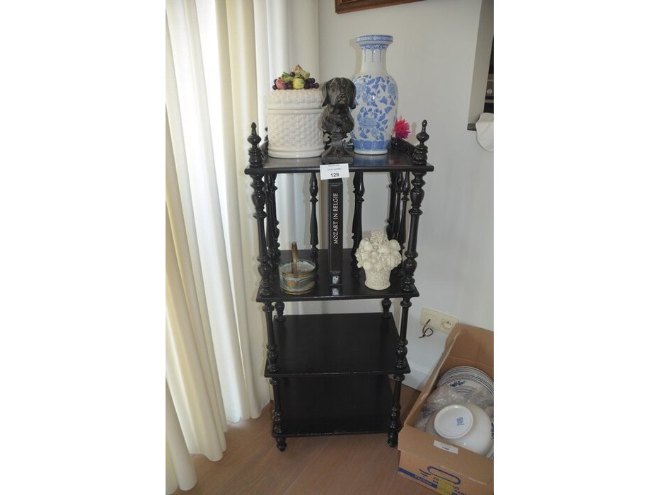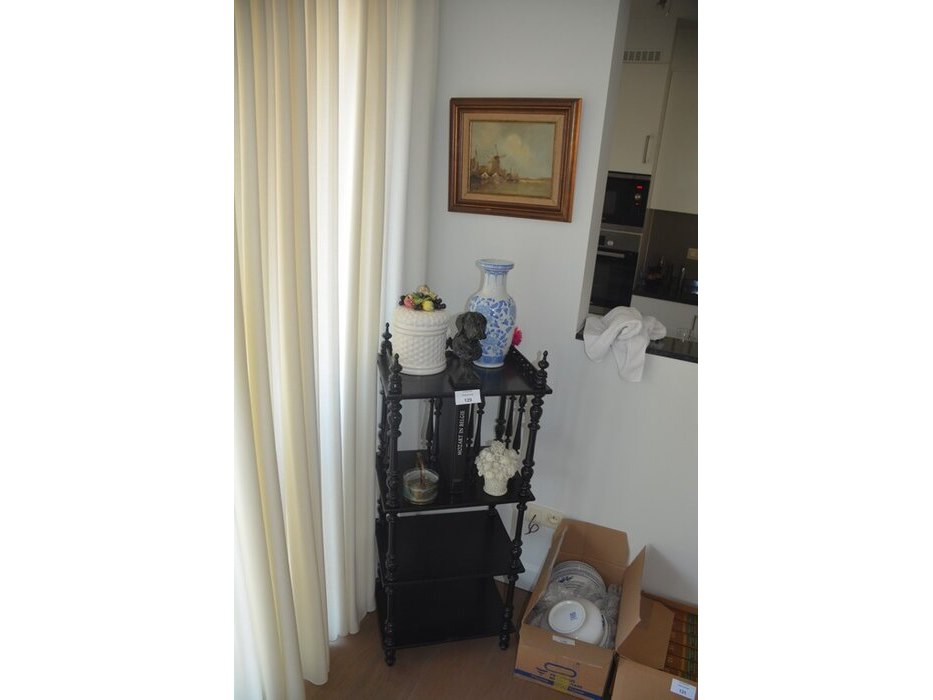 Houten rekje met 4 leggers, 6 sierstukken, schilderij