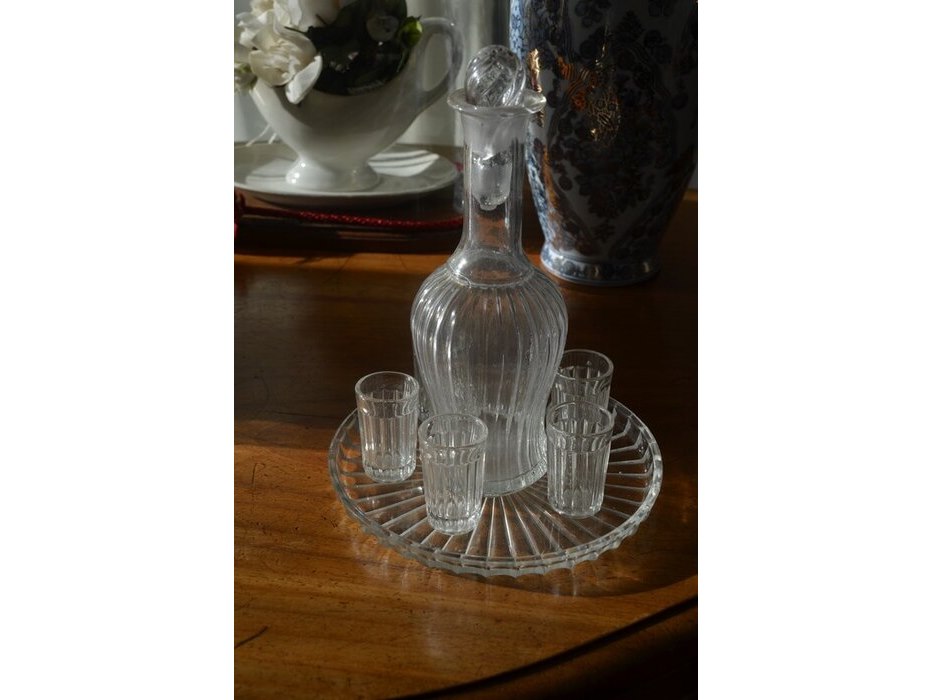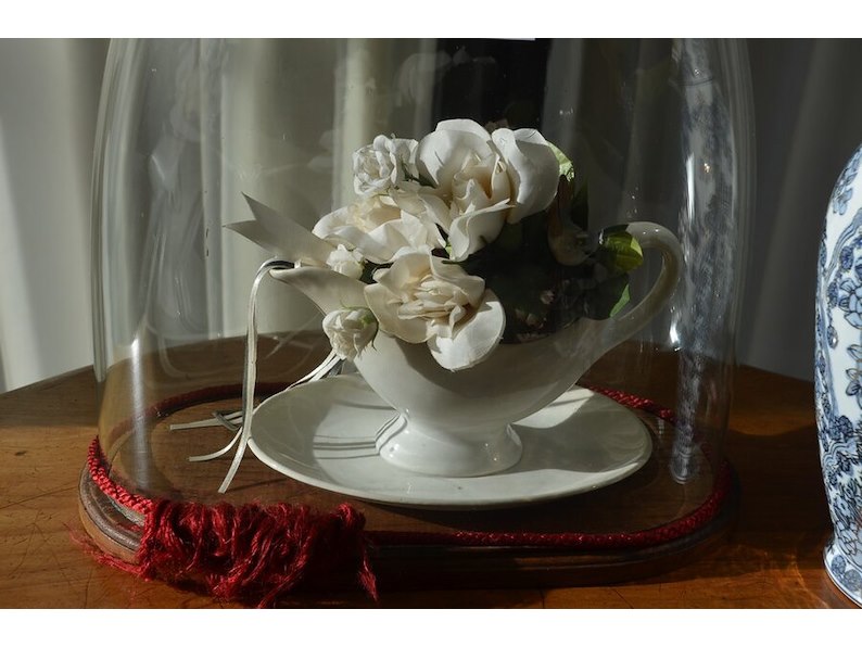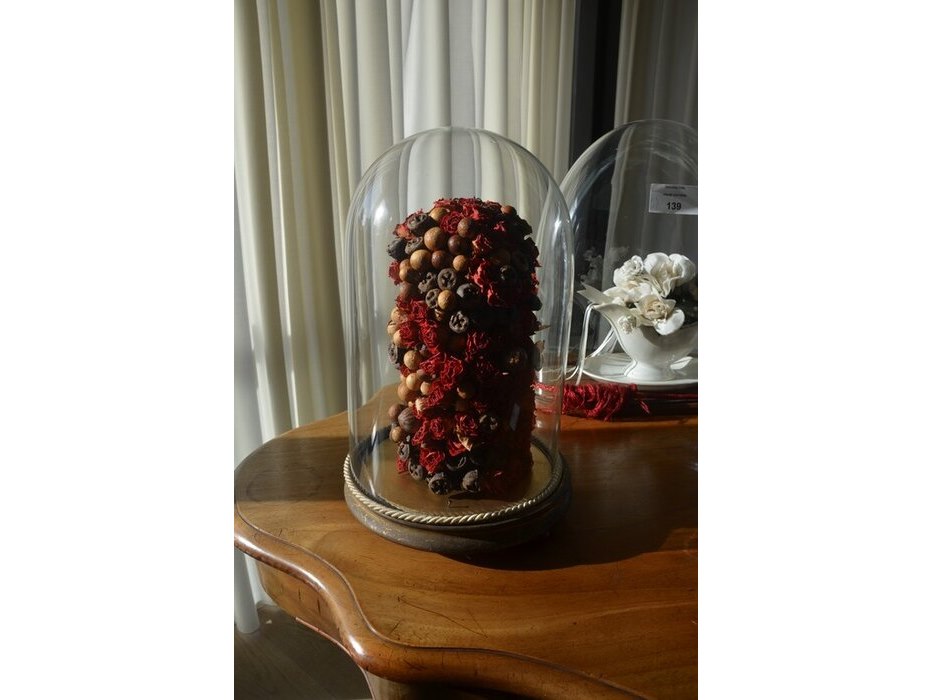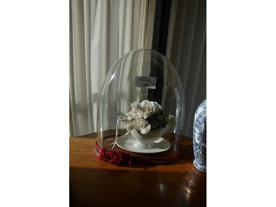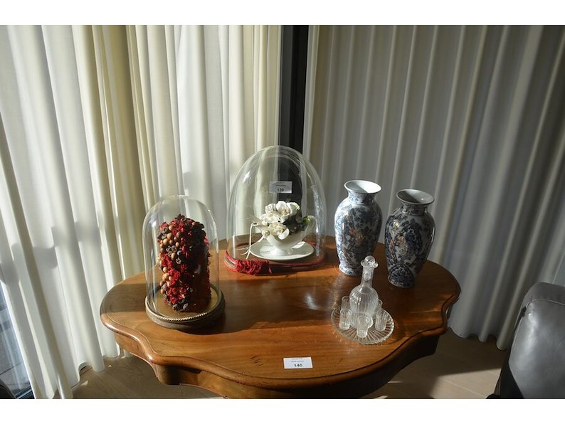 2 bloemstukken onder stolp, 2 porseleinen vazen, glazen drinkset met karaf
