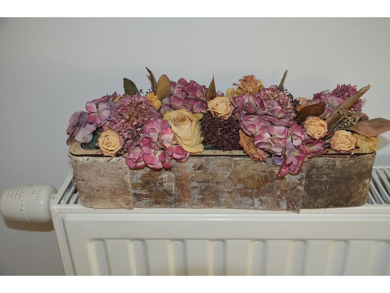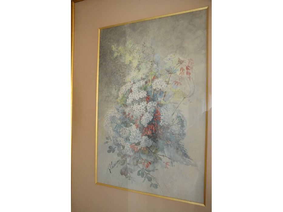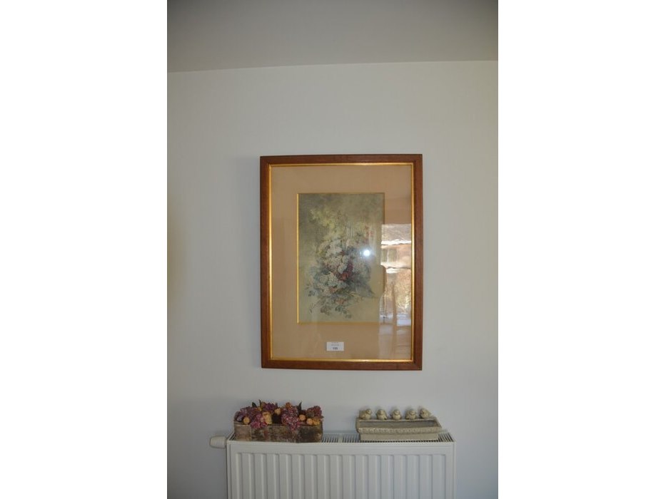 Schilderij bloemen achter glas getekend, 2 sierstukken