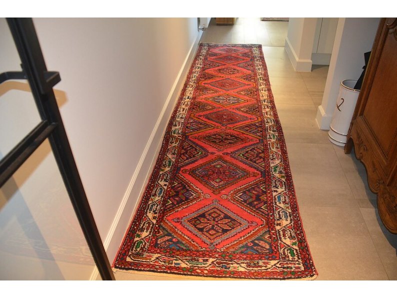 Oosterse loper ca. 3 m, smeedijzeren kapstok, porseleinen paraplubak