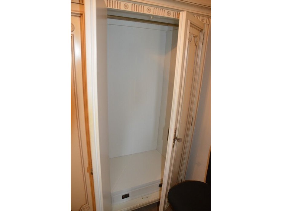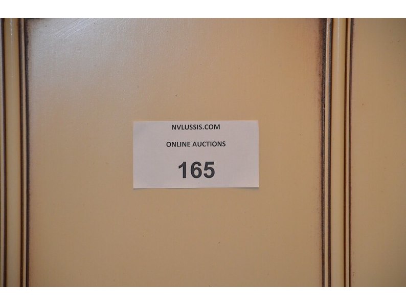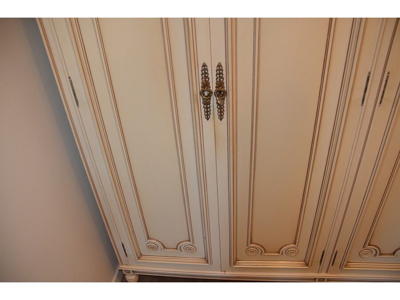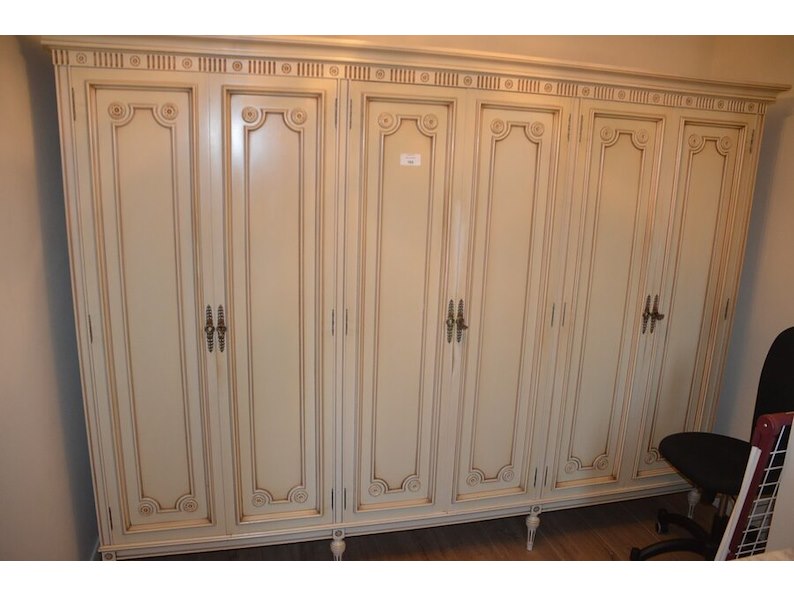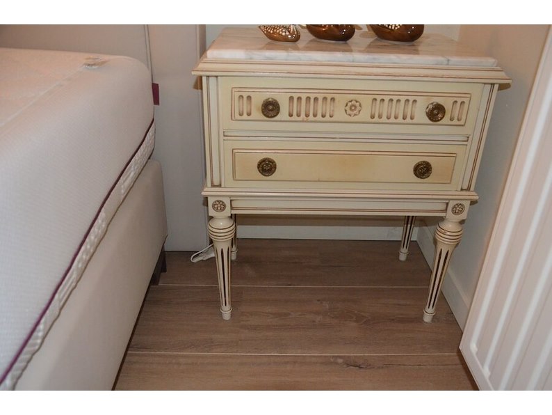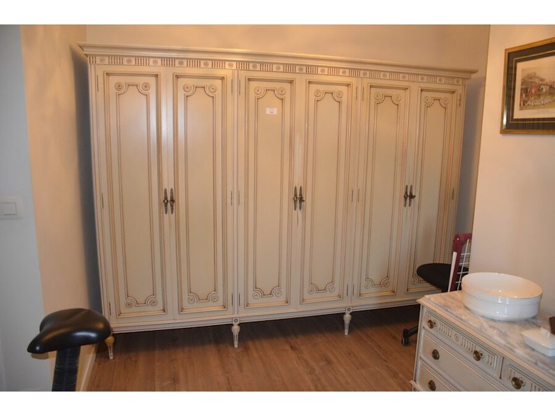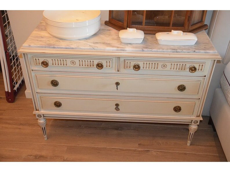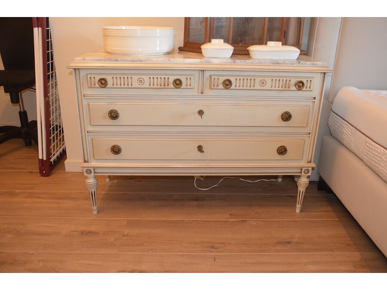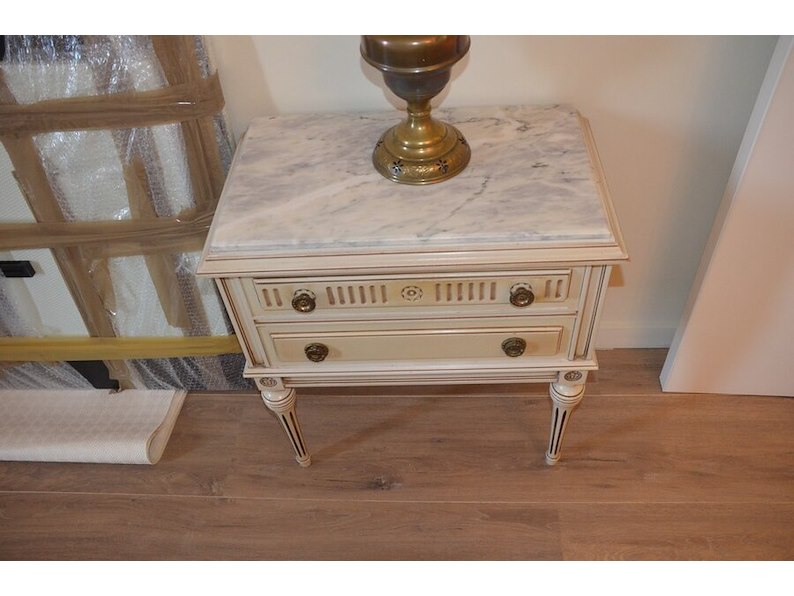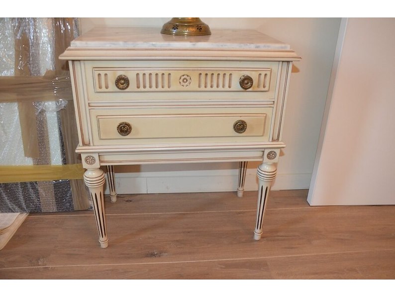 Craquelé slaapkamerkast met 6 deuren, carquelé commode met marmeren blad en 4 lades, craqluelé nachtkastje met marmeren blad en 2 lades