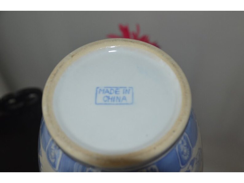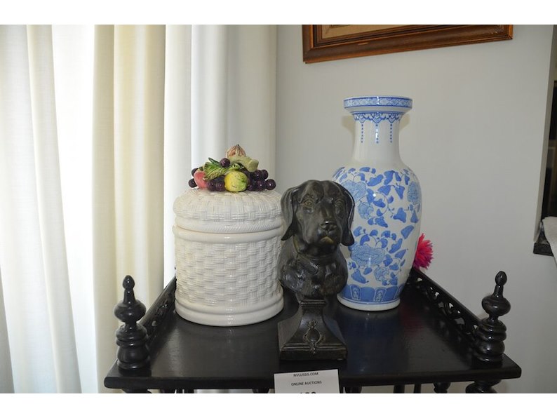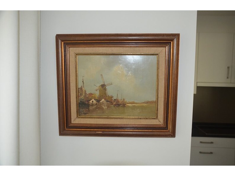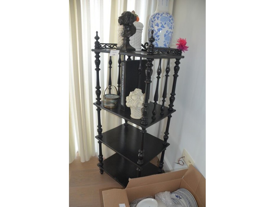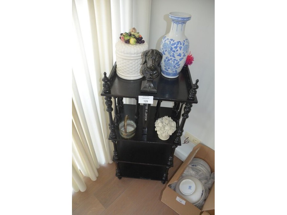 Houten rekje met 4 leggers, 6 sierstukken, schilderij