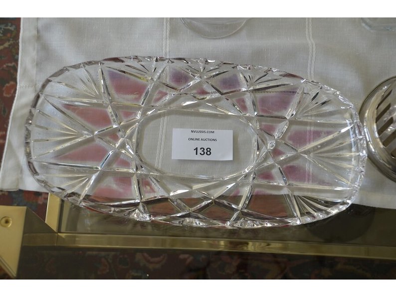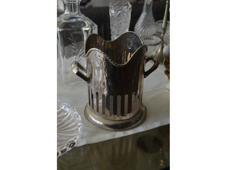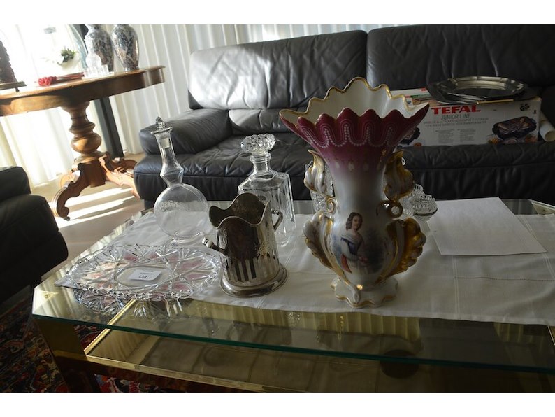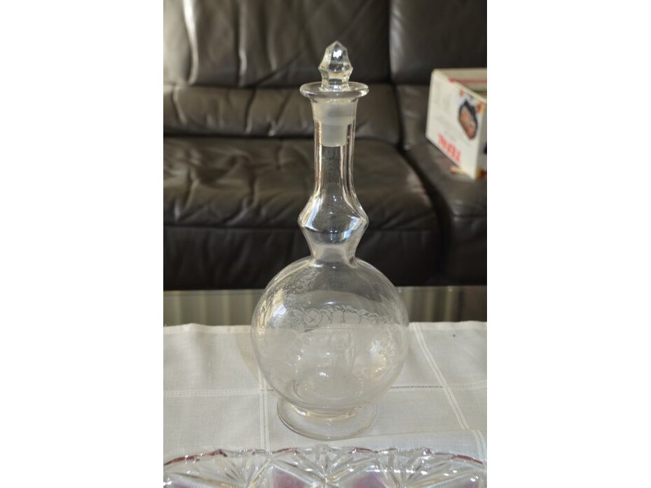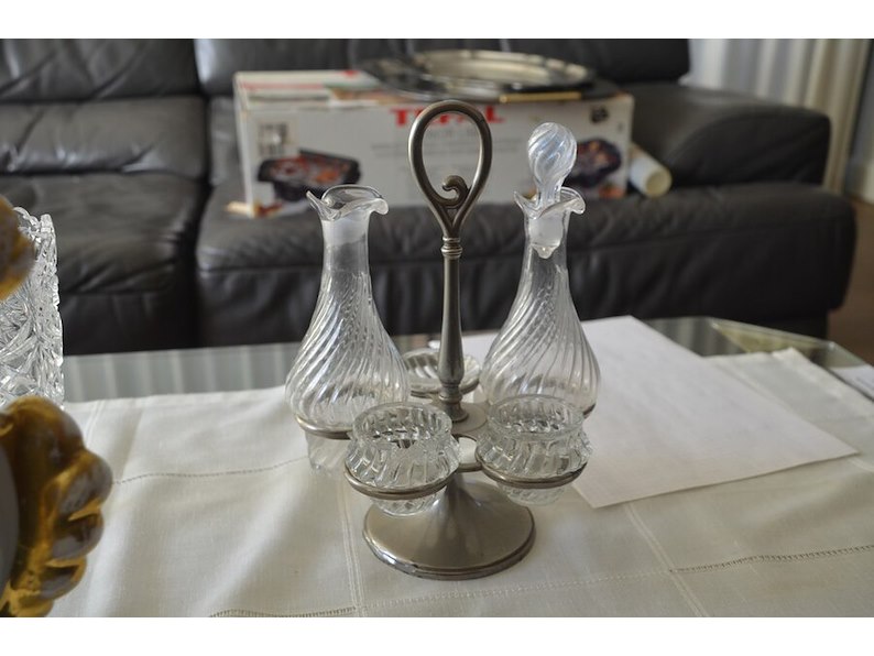 2 glazen karaffen, glazen schotel, verzilverde flessen houder, porseleinen vaas, kruidensetje met verzilverde houder, kristallen glas