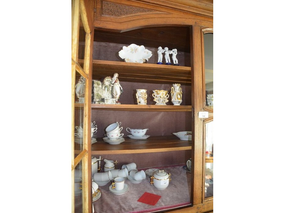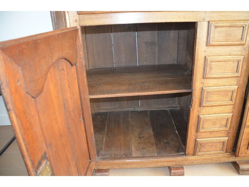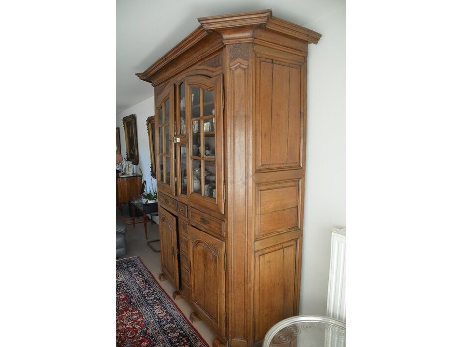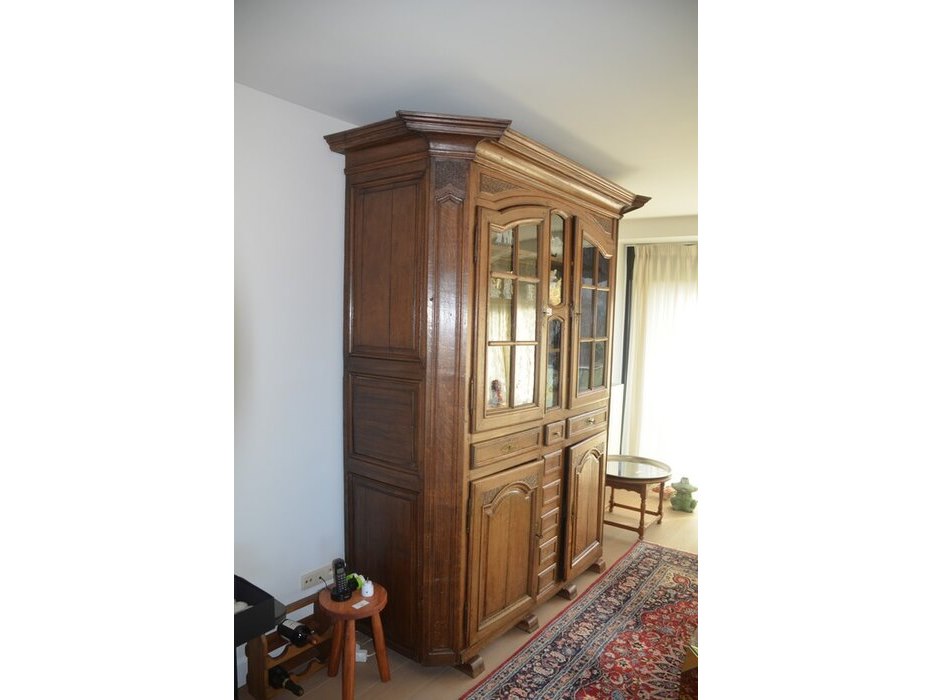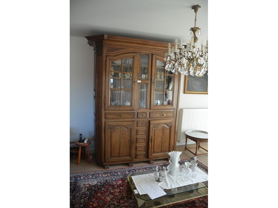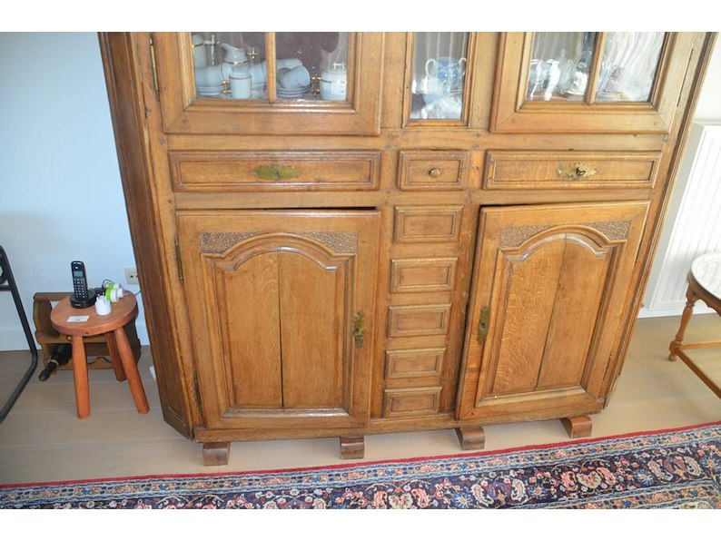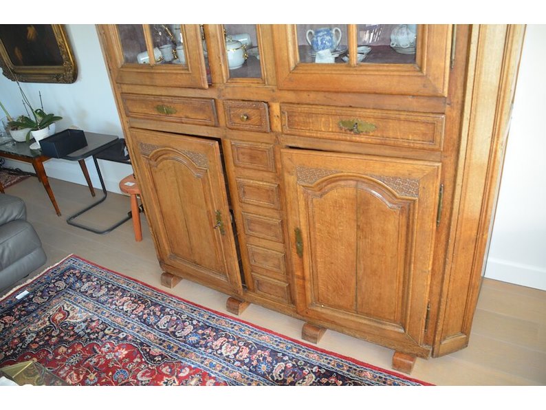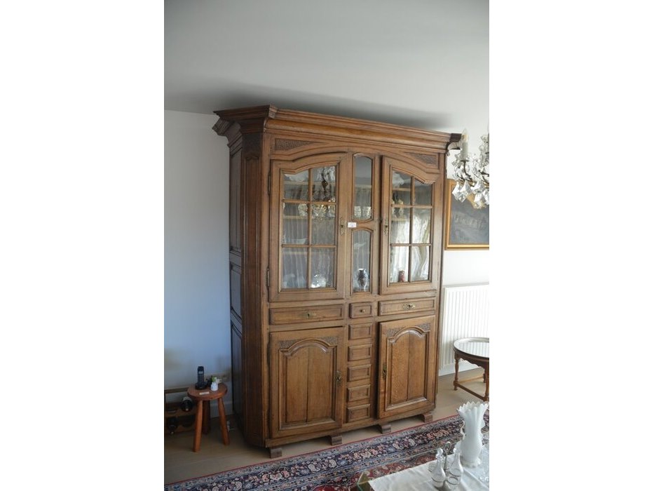 Antiek eiken kast met 2 deuren en 3 laden met opzet vitrine 2 deuren