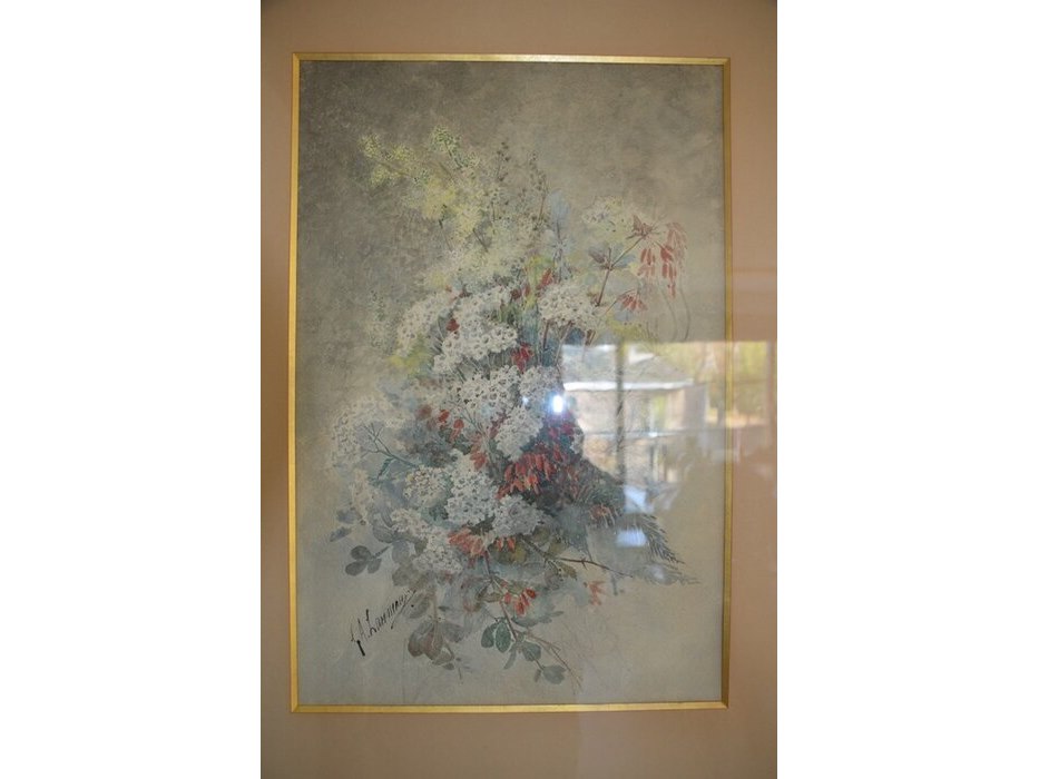 Schilderij bloemen achter glas getekend, 2 sierstukken