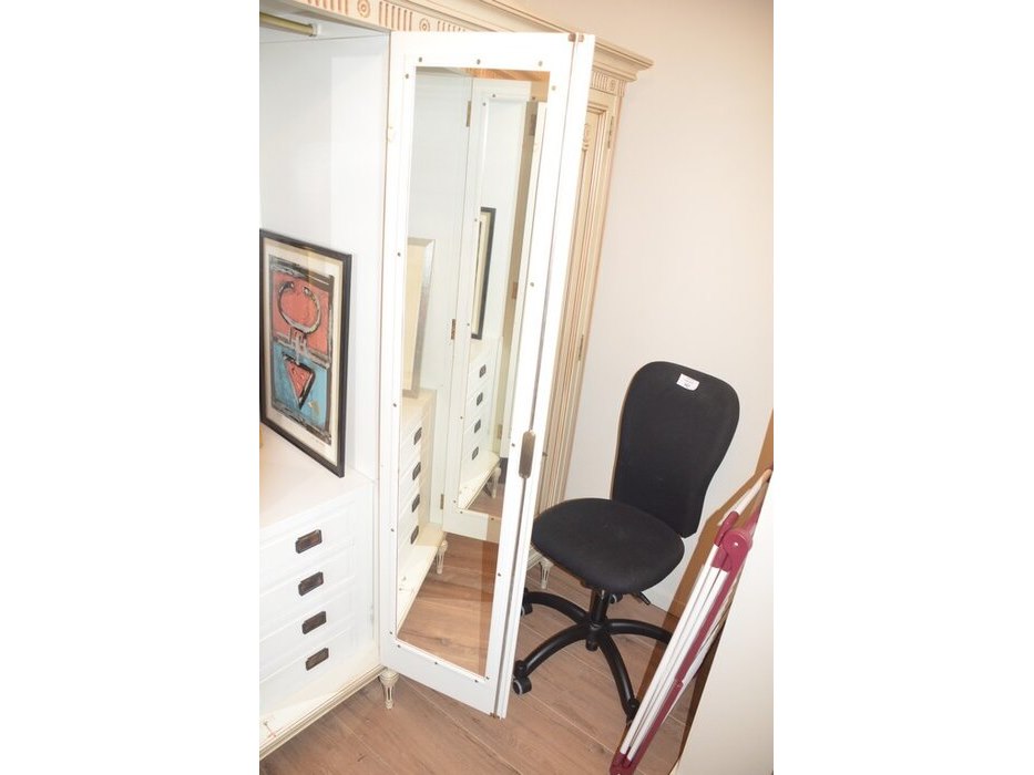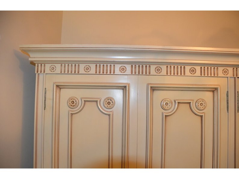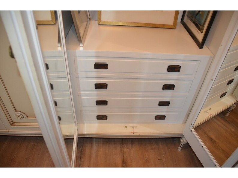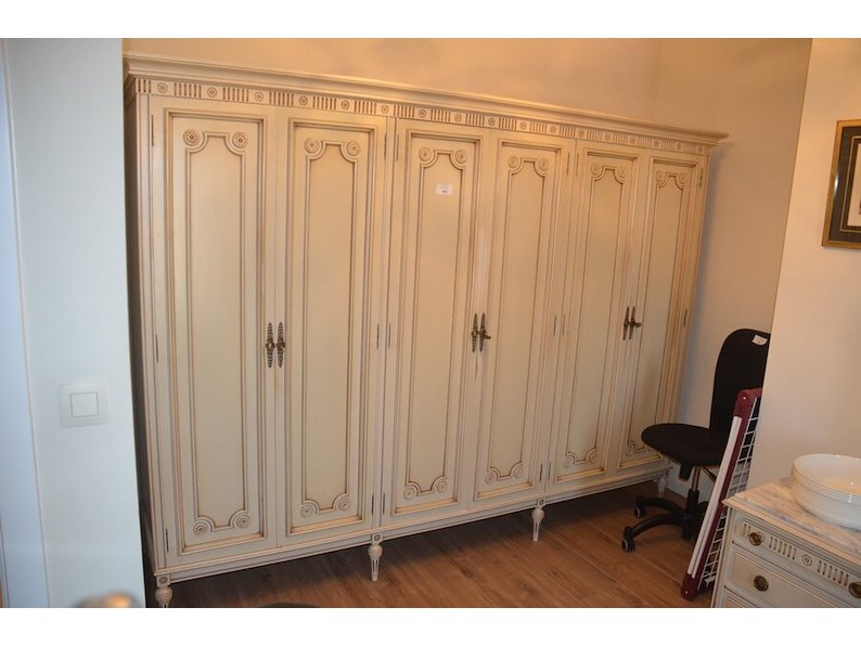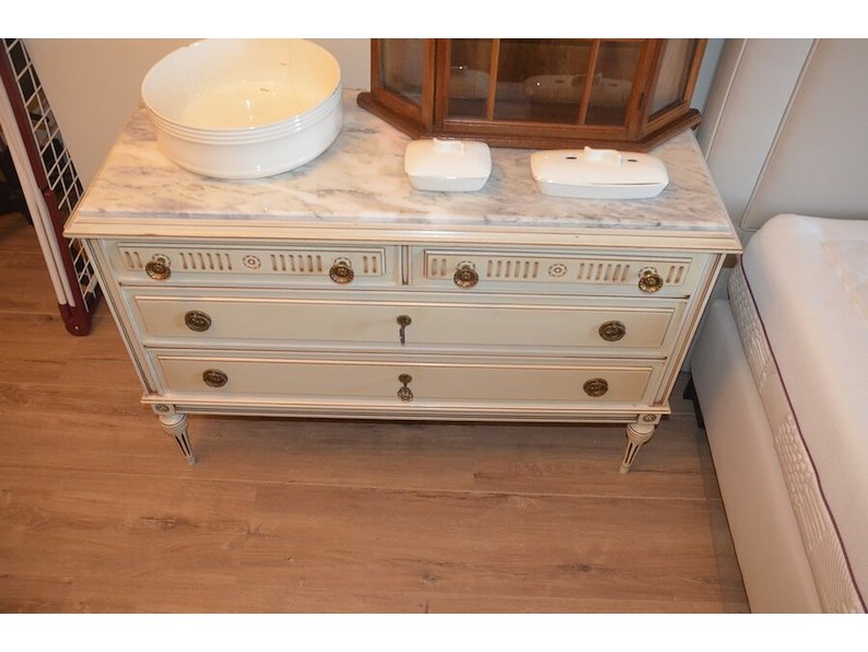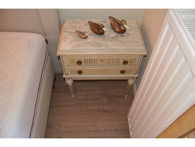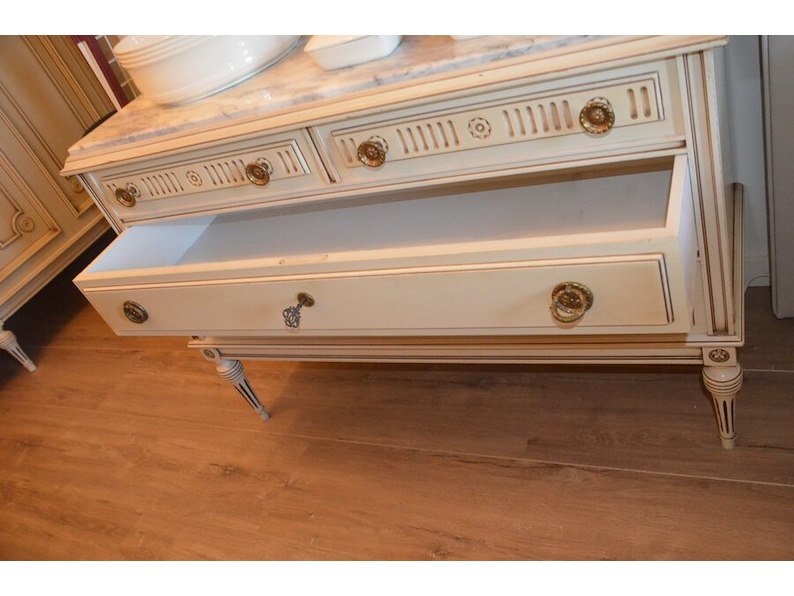Craquelé slaapkamerkast met 6 deuren, carquelé commode met marmeren blad en 4 lades, craqluelé nachtkastje met marmeren blad en 2 lades