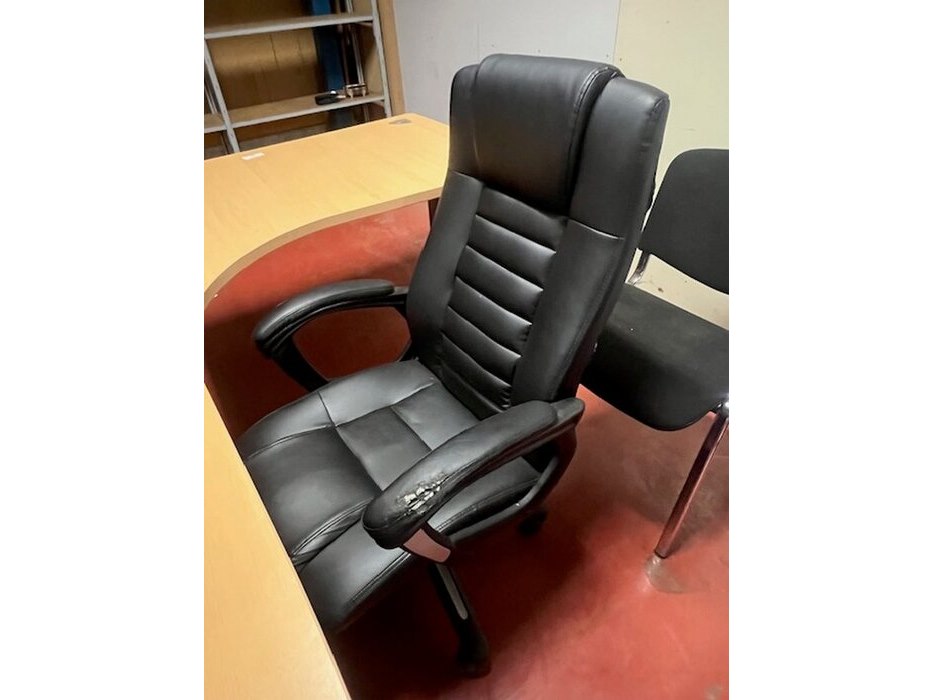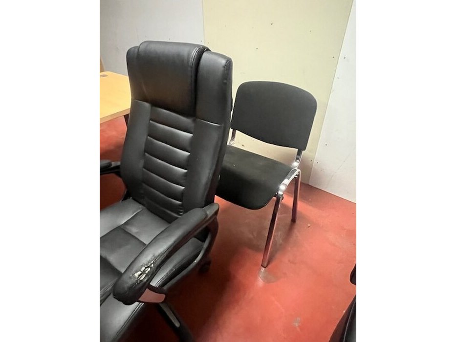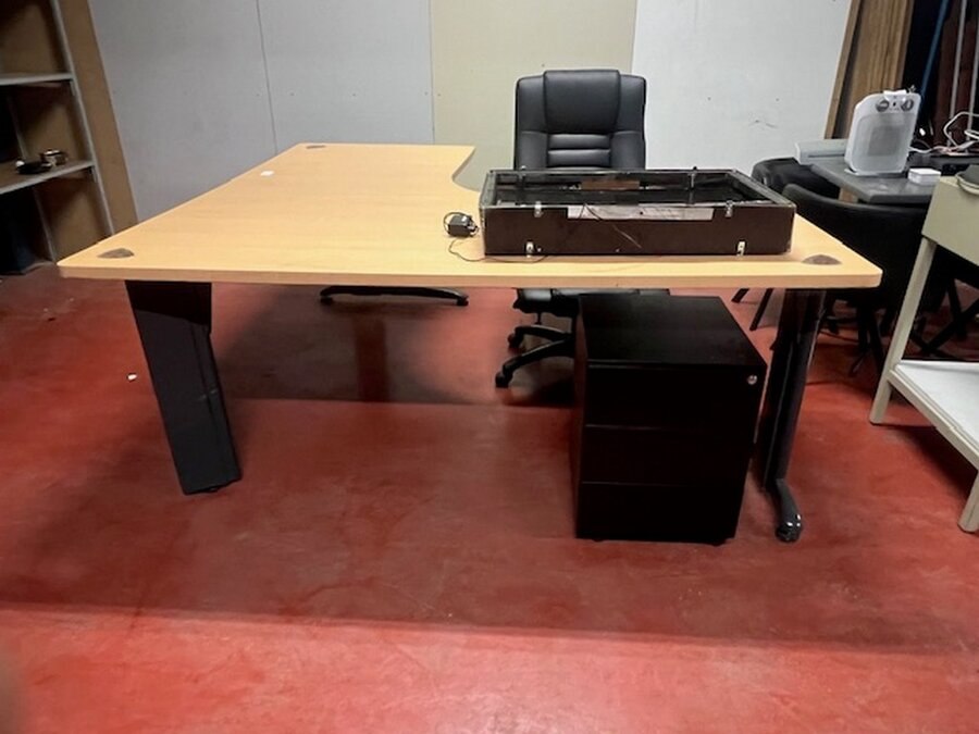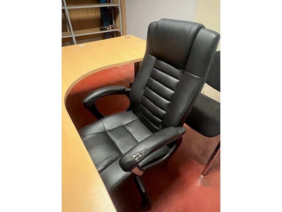 Licht kleurig l-vormig bureel zwart onderstel, zwart lederen rolbureelzetel met armleuning, 2 bureelstoelen zwart chroom onderstel, ladenblok zwart 3 laden (11)