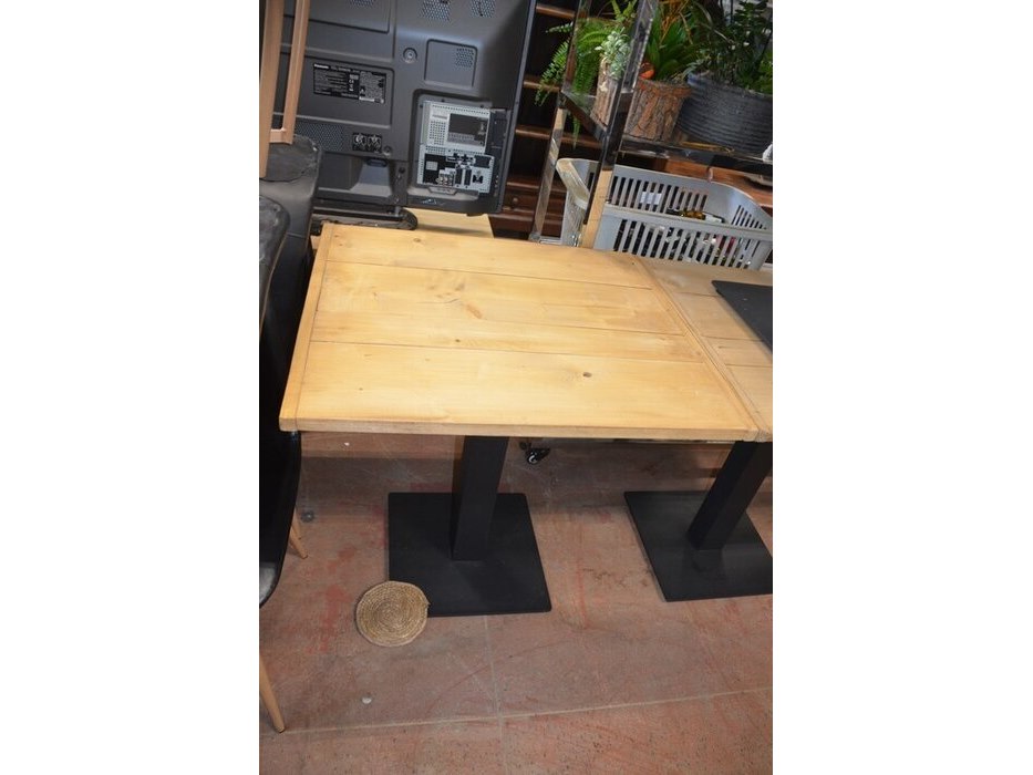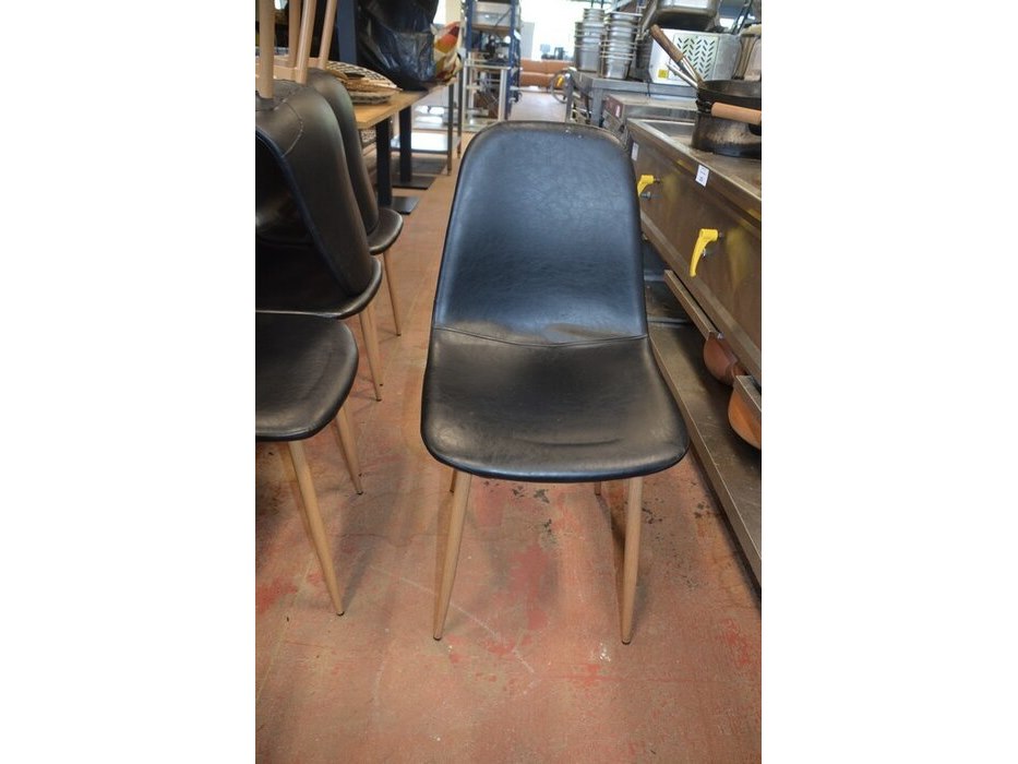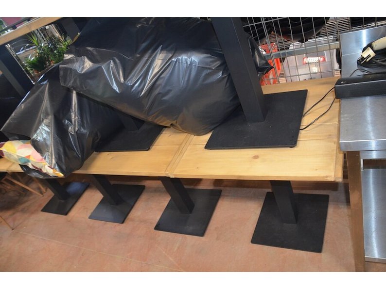 10 vierkantige tafels houten blad zwart metalen voet, 11 moderne zwart lederen stoelen, partij kussens