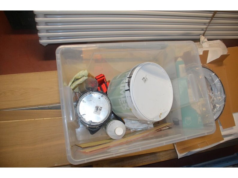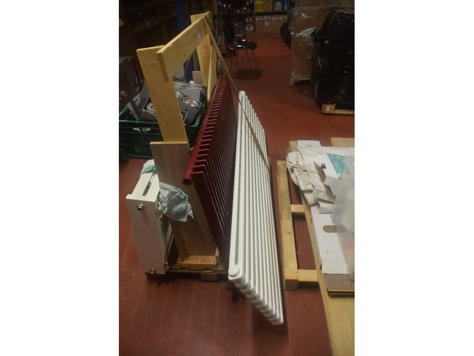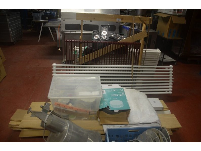 Radiator afm. 200x50, radiator afm. 120x80, radiator afm. 160x60, pvc bak met 12 spots, resten laminaat, dekzeil