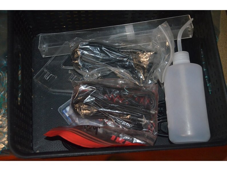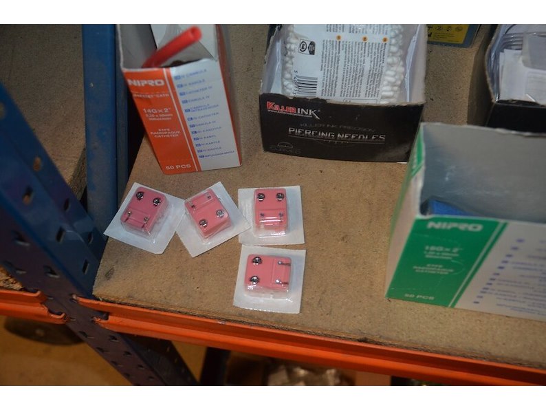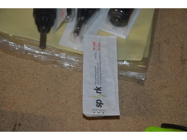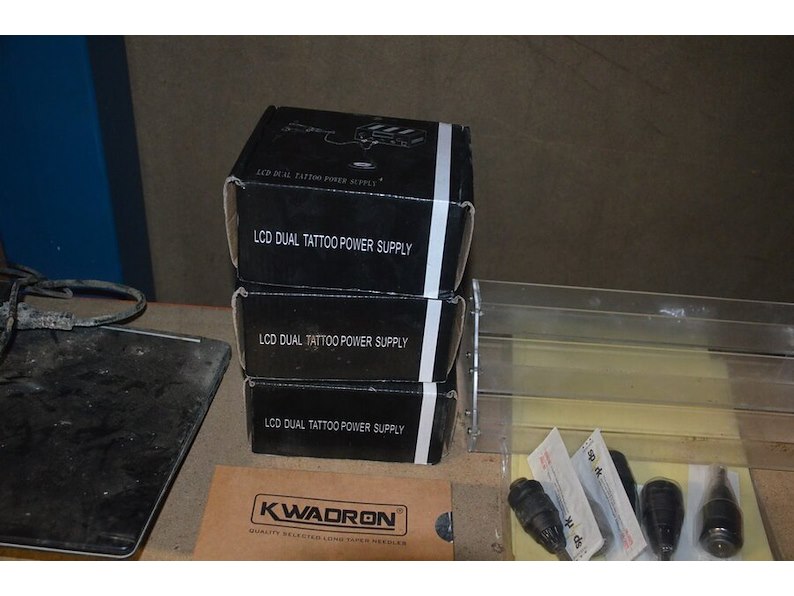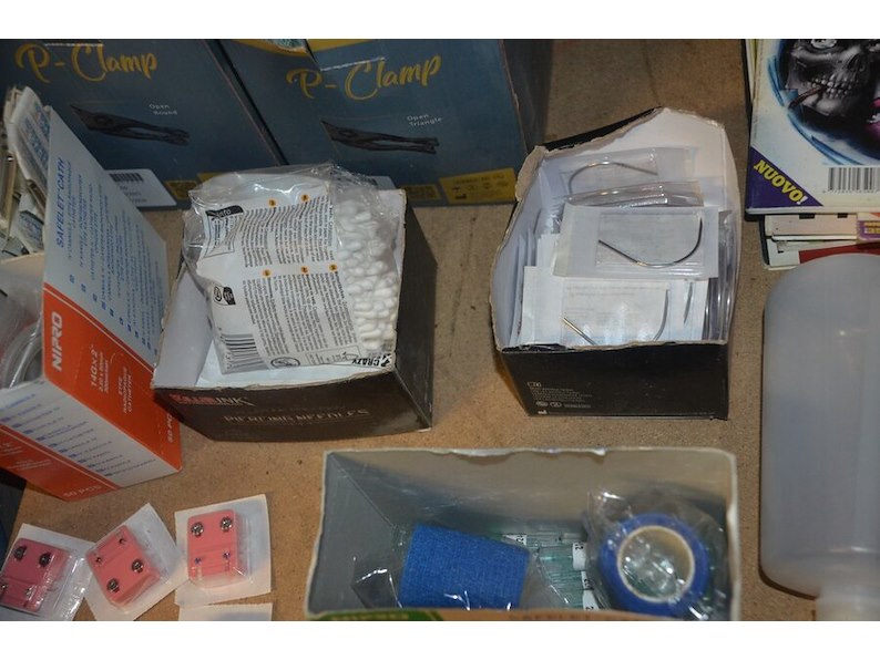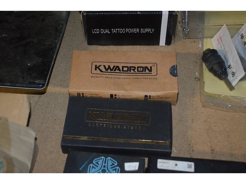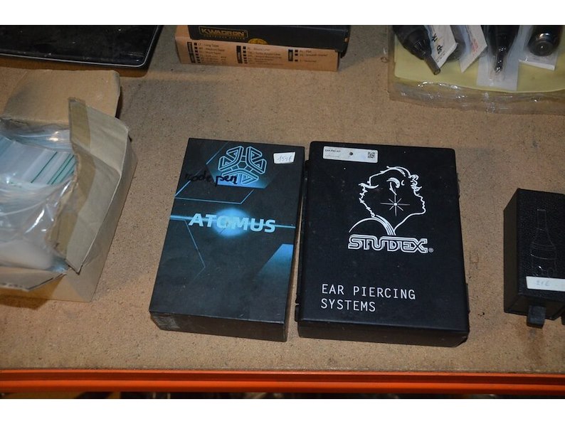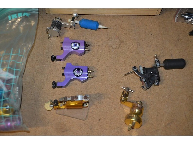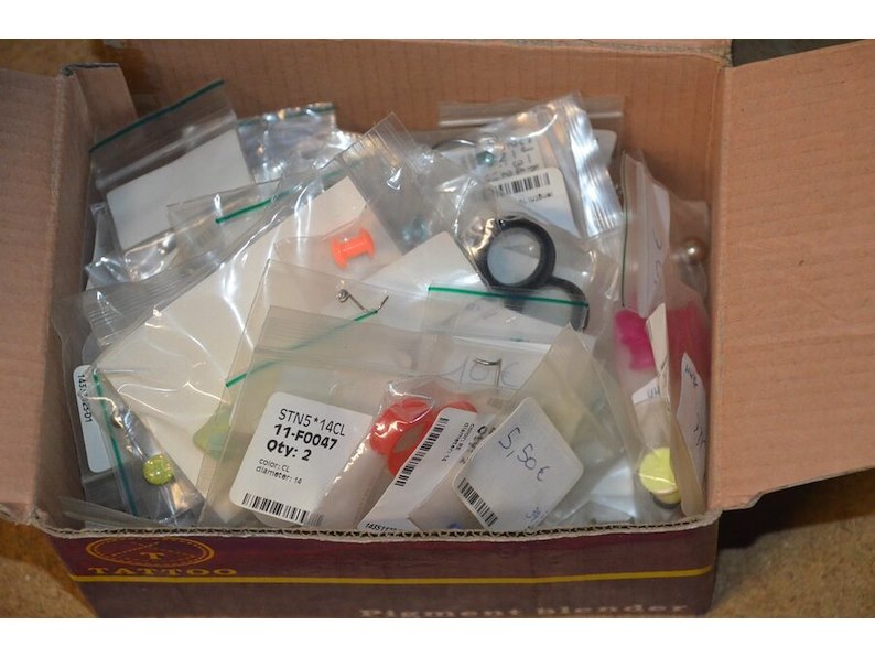 Doosje met ca. 80 stuks piercings en stretchers, ca. 36 metalen verstelbare tatoeage handvaten, elektrische tatoeage machine goud rotary, 2 spoel tatoeage machines,10 wergwerp cartridges grip zwart, 2 paarse bischop rotary tatoeage machines,