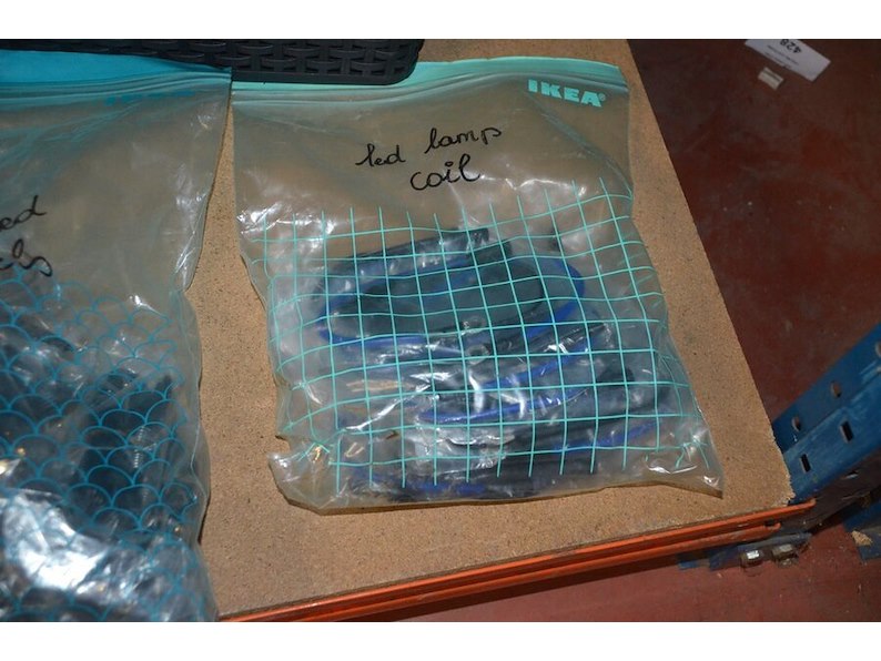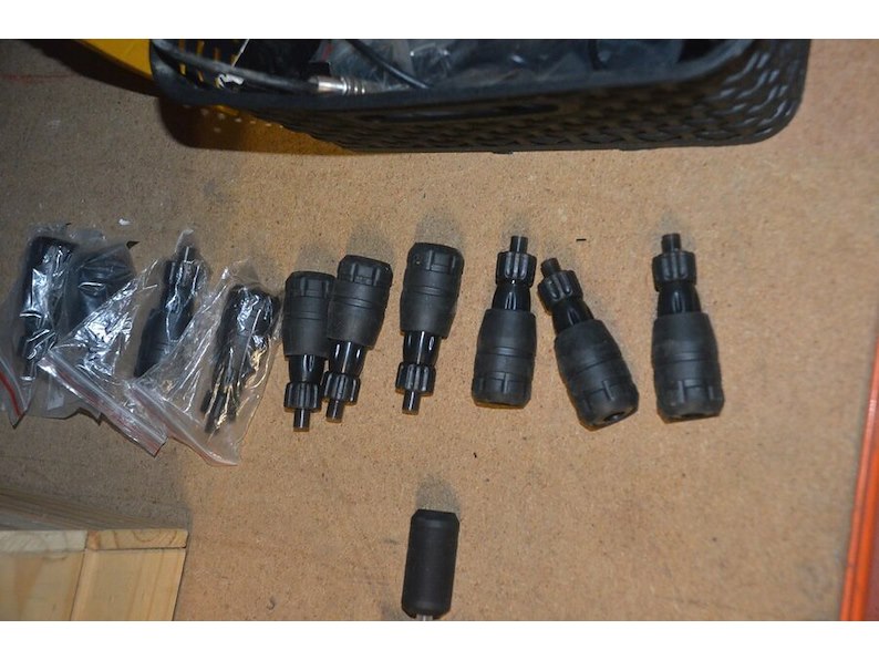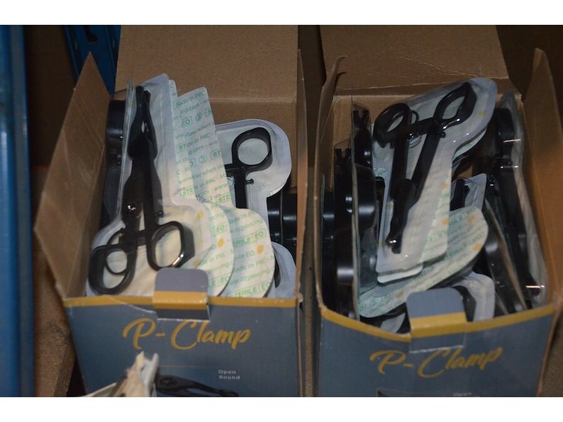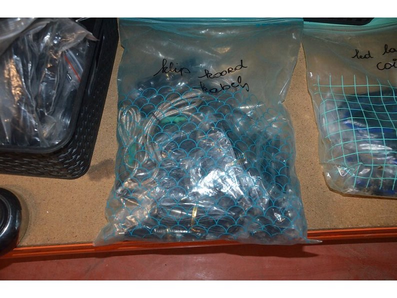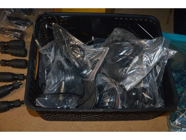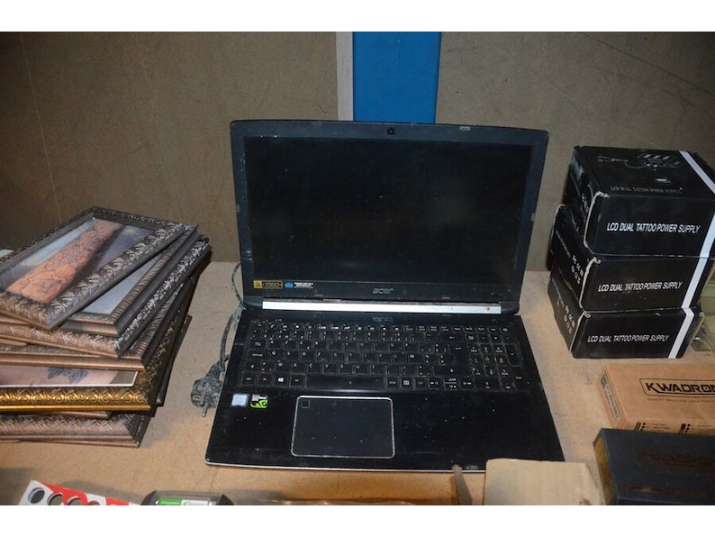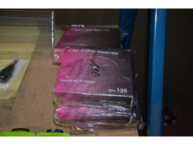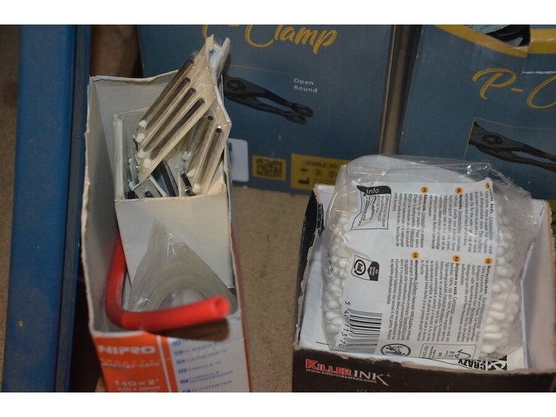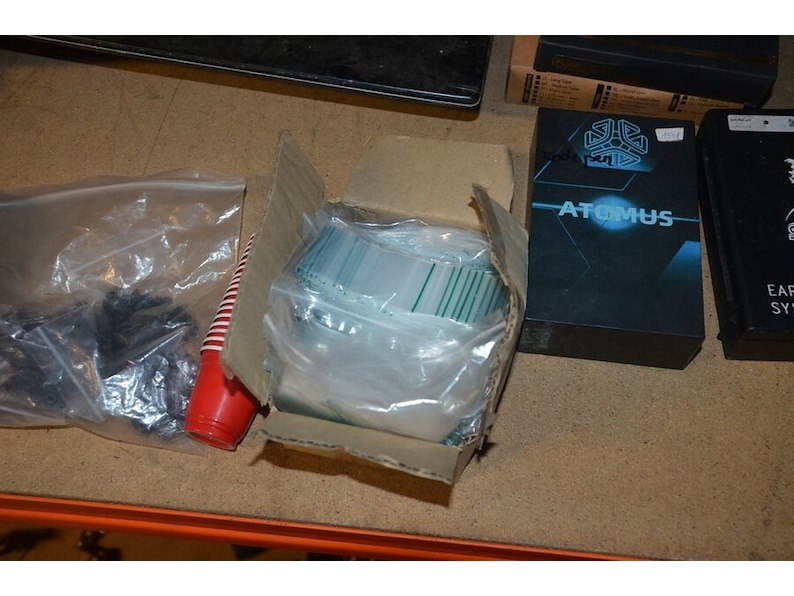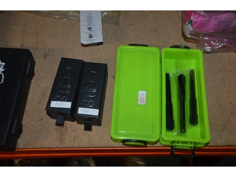 Doosje met ca. 80 stuks piercings en stretchers, ca. 36 metalen verstelbare tatoeage handvaten, elektrische tatoeage machine goud rotary, 2 spoel tatoeage machines,10 wergwerp cartridges grip zwart, 2 paarse bischop rotary tatoeage machines,