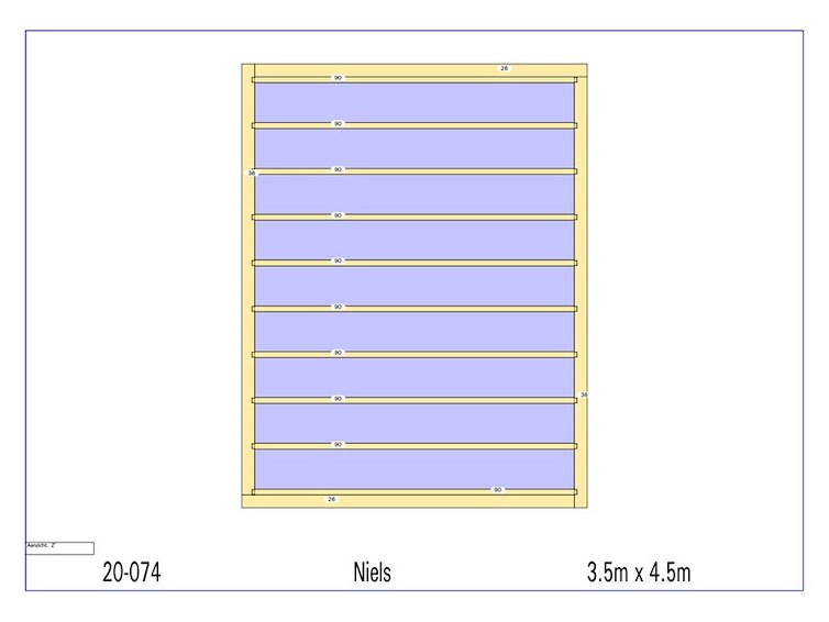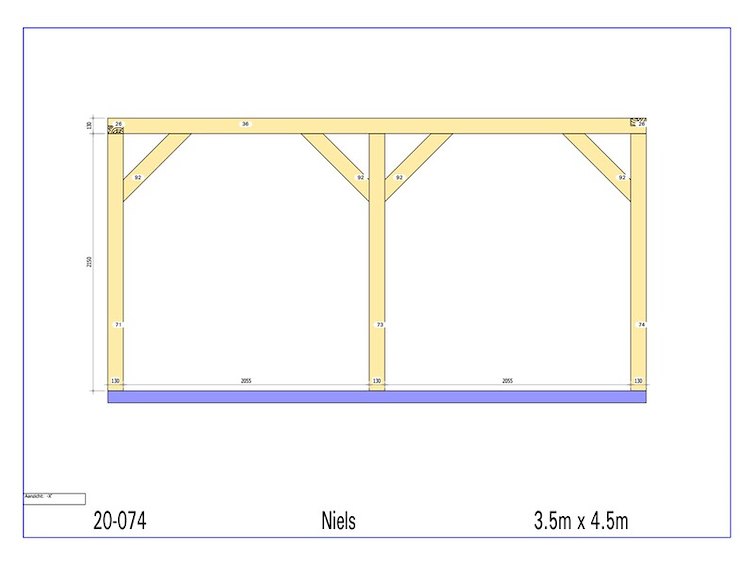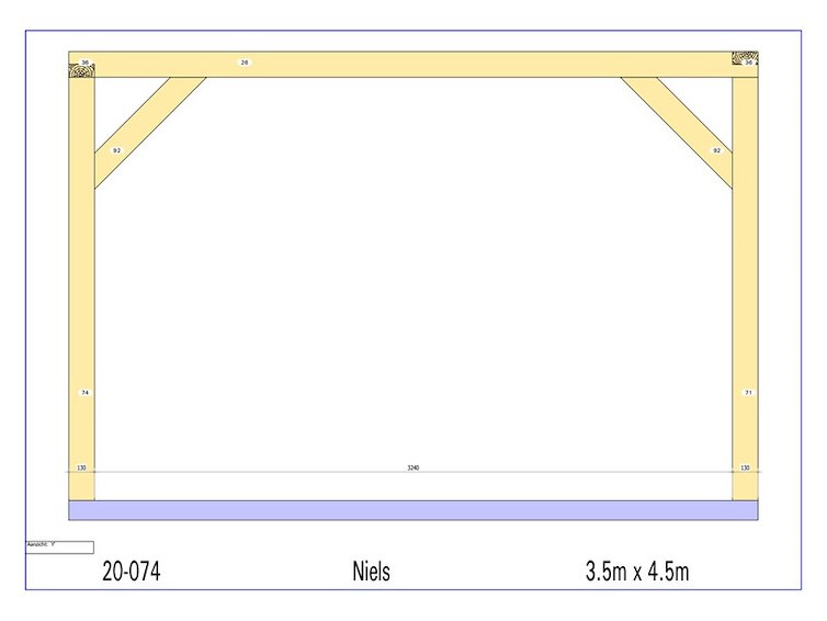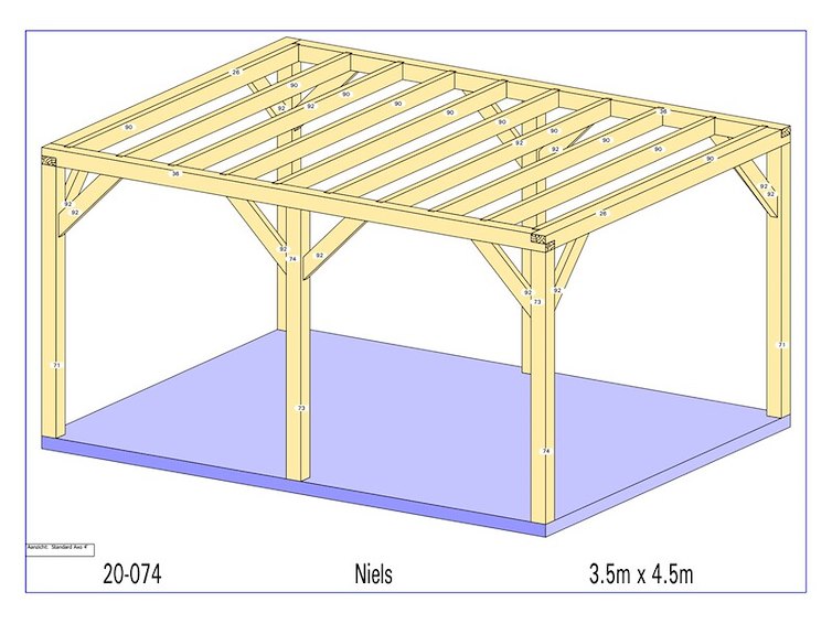 Product: Overkapping Materiaal: Fijnspar Afmeting: 3500 x 4500 x 2280 mm Specificaties: Palen : 130x130 mm Liggers :130x130 mm Roostering : 60x130 mm Schuine stekers : 60x130 mm Pakket afmeting : circa 4500x1200x800 mm Gewicht pakket : circa 350 kg