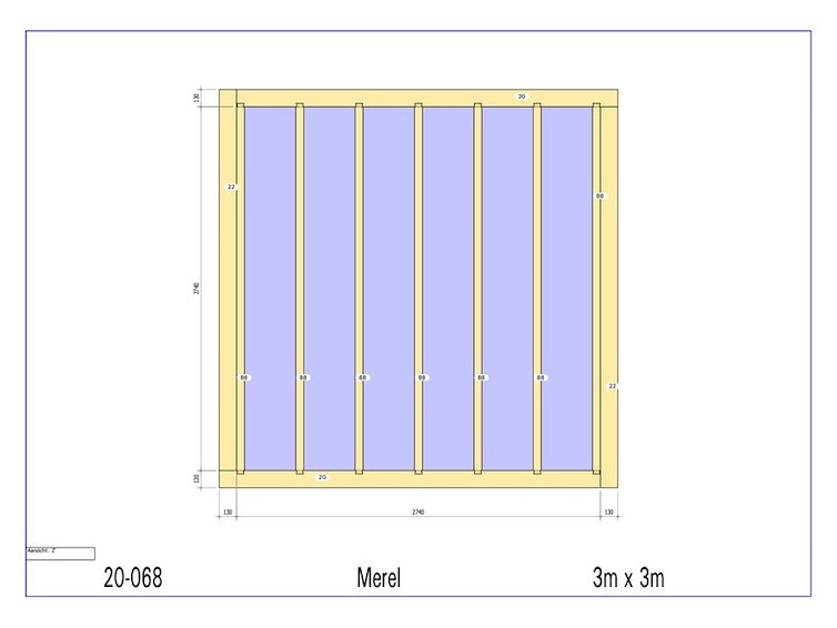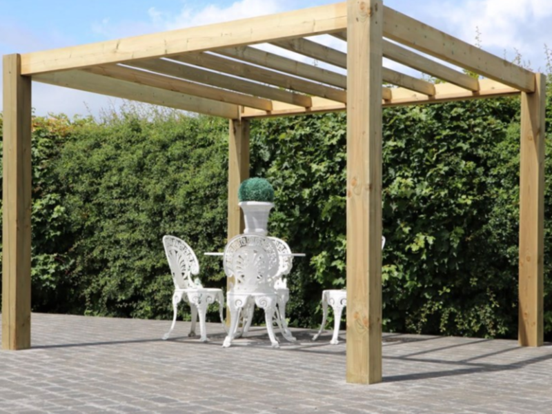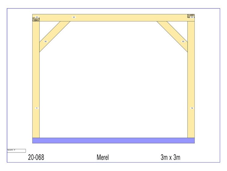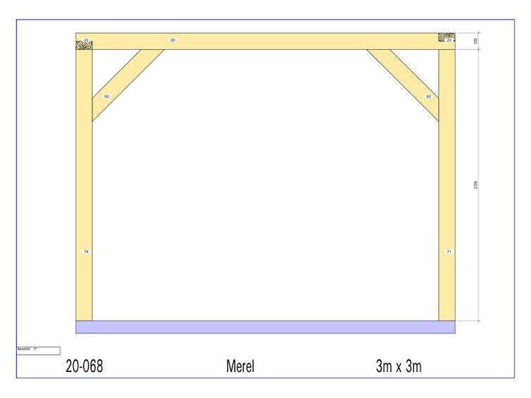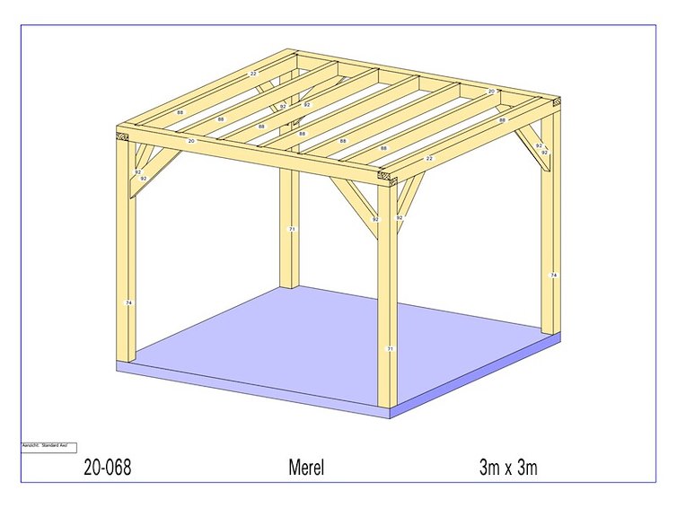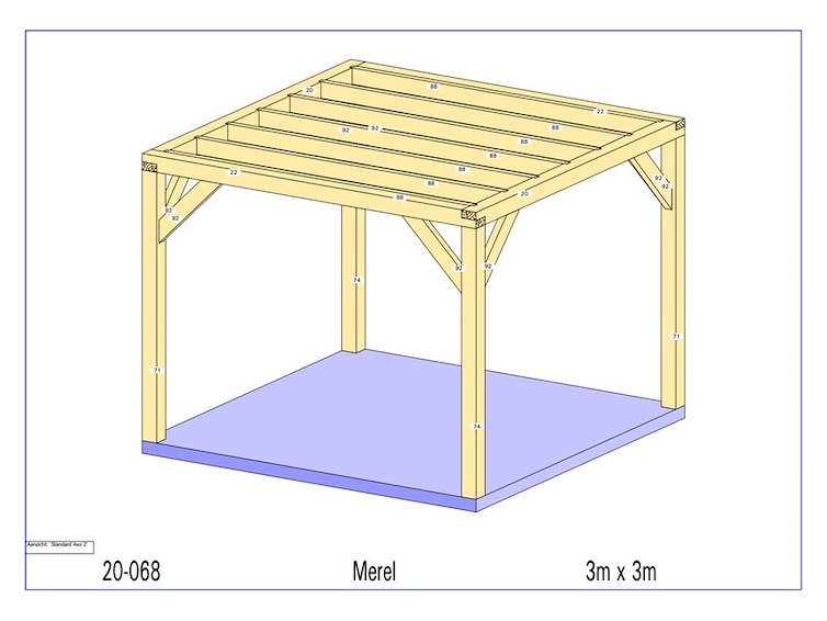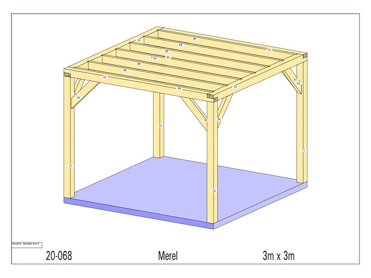 Product: Overkapping Materiaal: Fijnspar Afmeting: 3000 x 3000 x 2280 mm Specificaties: Palen : 130x130 mm Liggers :130x130 mm Roostering : 60x130 mm Schuine stekers : 60x130 mm Pakket afmeting : circa 3000x1200x750 mm Gewicht pakket : circa 300 kg