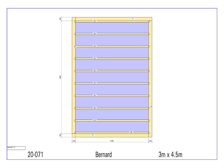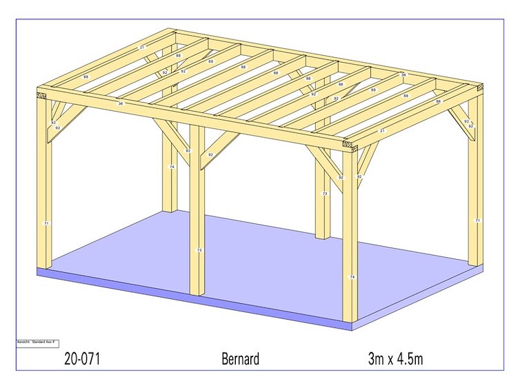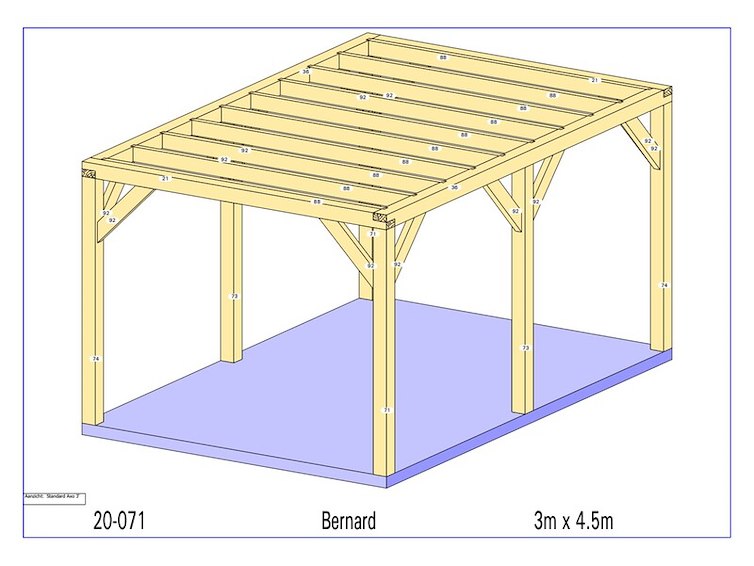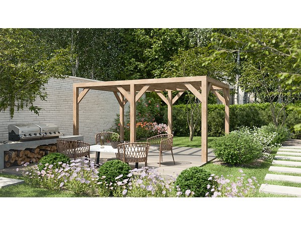 Product: Overkapping Materiaal: Am eiken Afmeting: 3000 x 4500 x 2280 mm Specificaties: Palen : 130x130 mm Liggers :130x130 mm Roostering : 60x130 mm Schuine stekers : 60x130 mm Pakket afmeting : circa 4500x1200x750 mm Gewicht pakket : circa 600 kg