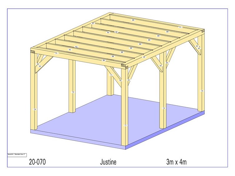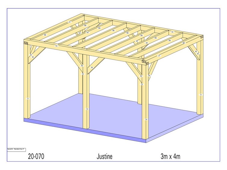 Product: Overkapping Materiaal: Am eiken Afmeting: 3000 x 4000 x 2280 mm Specificaties: Palen : 130x130 mm Liggers :130x130 mm Roostering : 60x130 mm Schuine stekers : 60x130 mm Pakket afmeting : circa 4000x1200x750 mm Gewicht pakket : circa 600 kg
