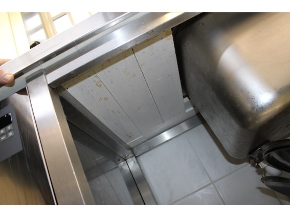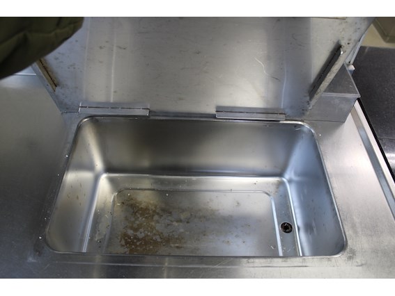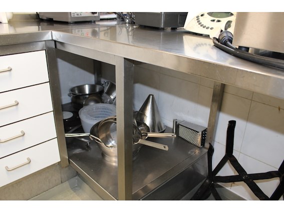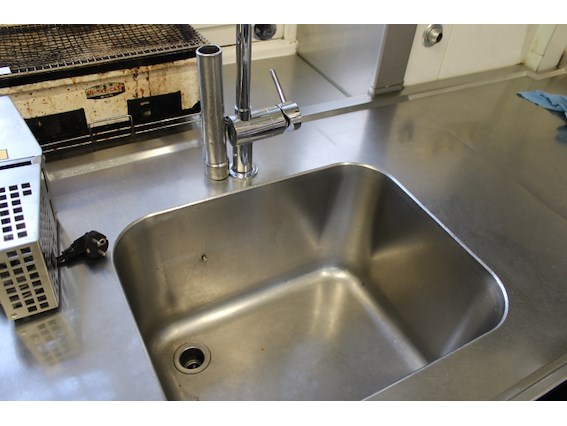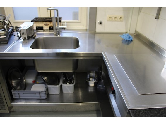 Inclusief hoekelement met bain marie (niet-werkend), kraan en spoelbak, te demonteren. Werkblad lengte 3m75, diepte 70cm. Hoekelement bain marie/ elektriciteit te zekeren. 1m40x60cm. Hoogte 85 cm. Zonder inhoud. Zelf te demonteren.