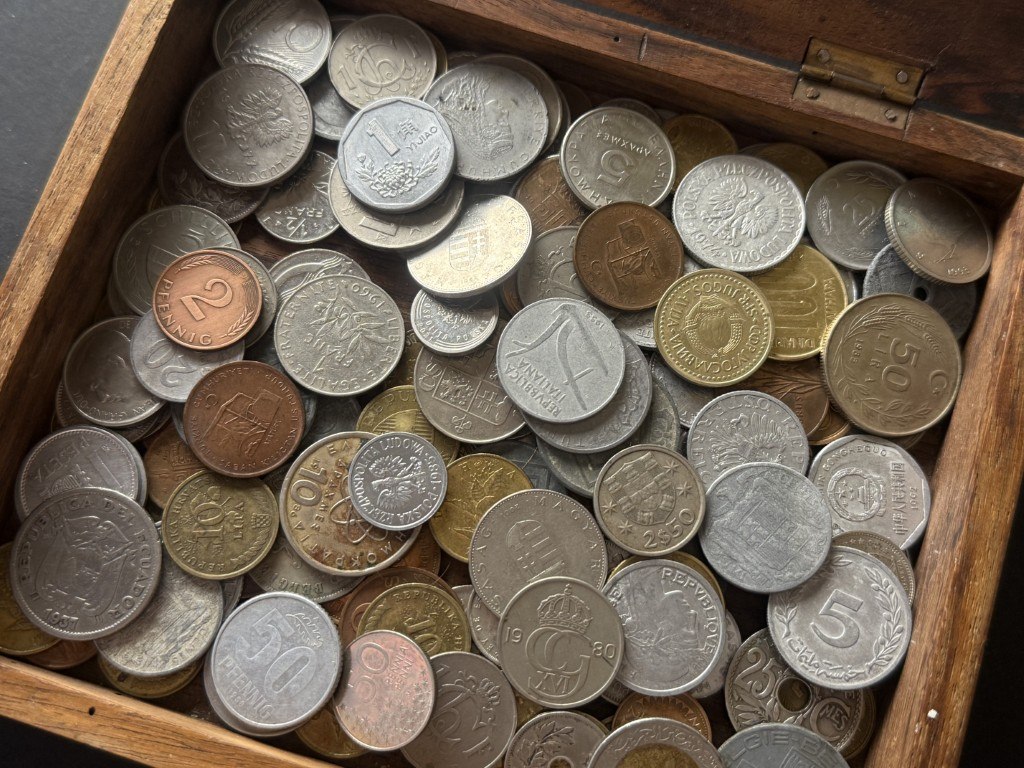 Houten doosje bali met diverse munten