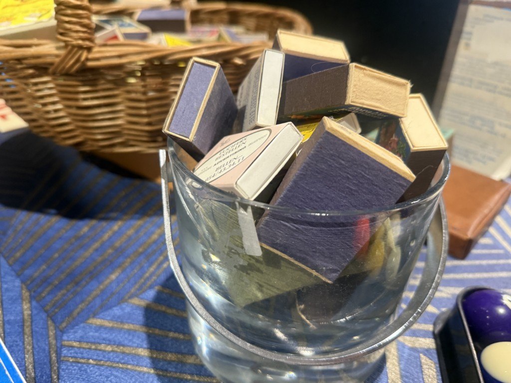 Ijsemmer + mand met diverse vintage gevulde luciferdoosjes