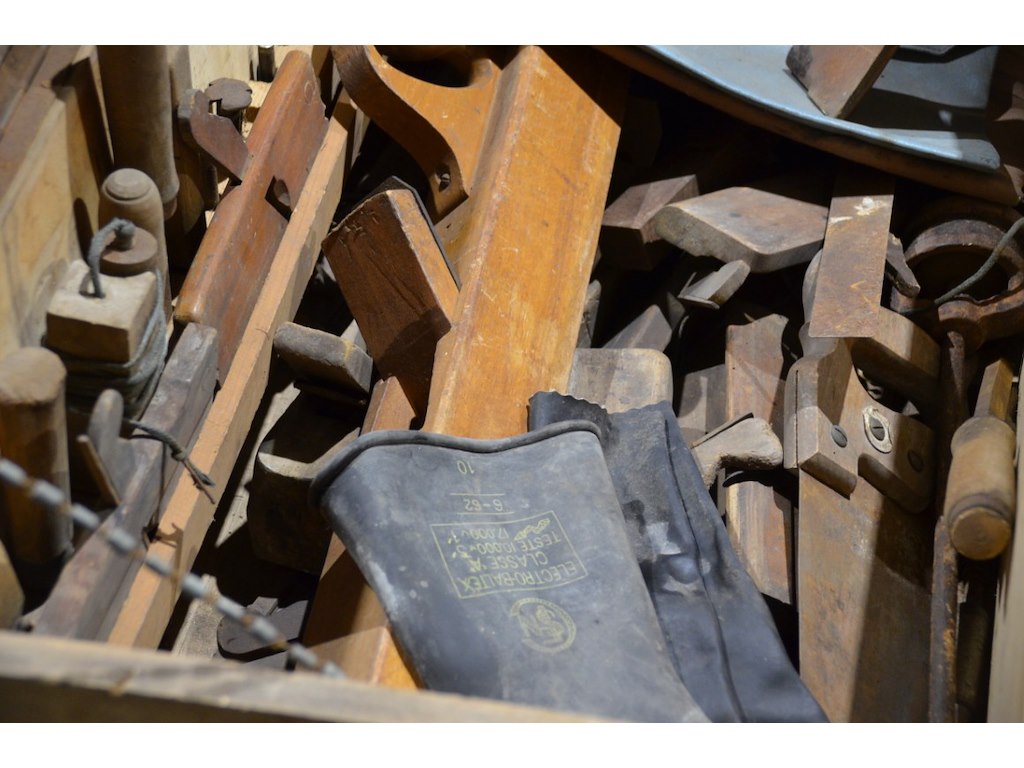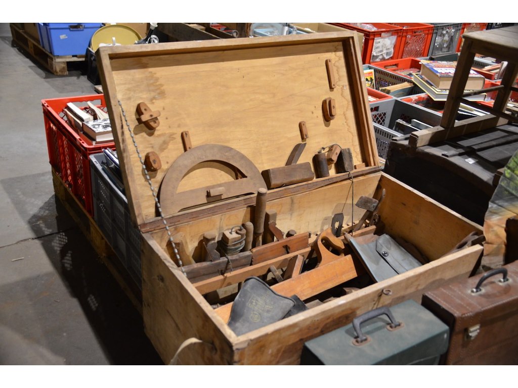 Antieke schrijnwerkerskoffer met diverse materialen