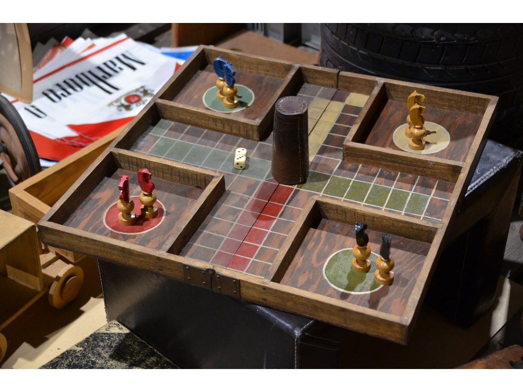 Houten speelbord met pionnnen op lederen bijzetpoef