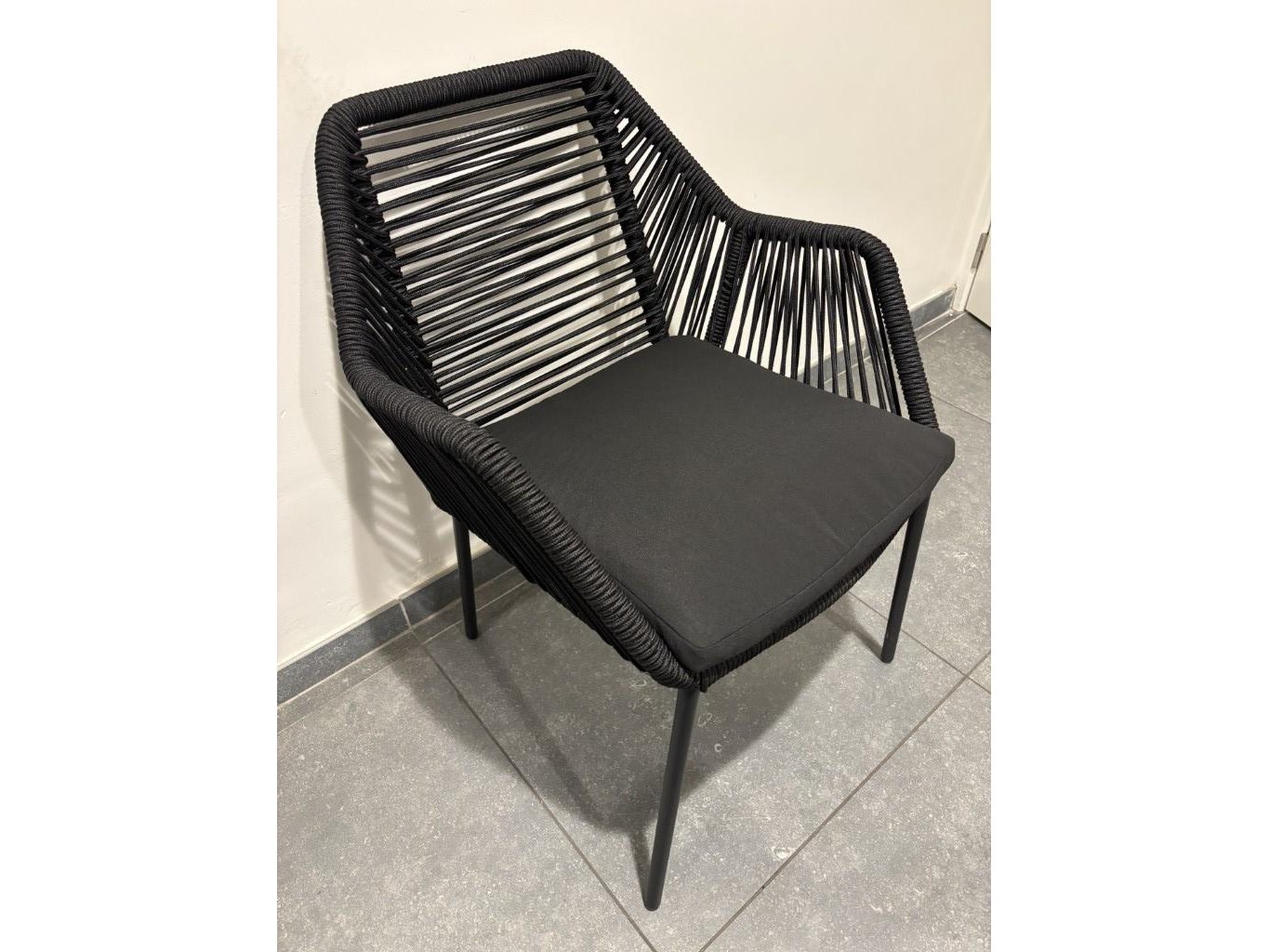 Stapelbare terrasstoel met armleuning, voorzien van een afneembaar en comfortabel zwart kussen. Dankzij het lichtgewicht metalen frame, afgewerkt in antraciet, en de strakke touwstructuur oogt de stoel luchtig en modern. De schuine rugleuning en armsteunen zorgen voor een aangename zitervaring.<br /> <br /> Strak zwart metalen frame met touwafwerking<br /> <br /> Inclusief zwart zitkussen in waterafstotende stof<br /> <br /> Stapelbaar en dus plaatsbesparend<br /> <br /> Normale hoogte (+- 47 cm)